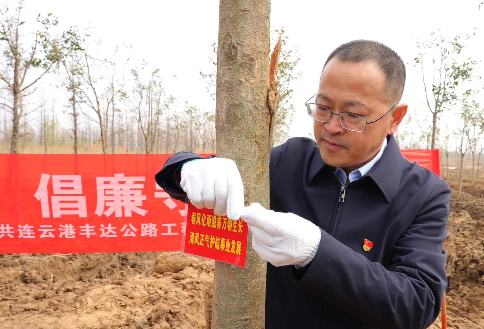 植树现场,干部职工分工协作、紧密配合,挥锹铲土、扶苗填坑,踩土定植、浇水保墒,一道道工序细致规范、一棵棵树苗精准栽种,一派干劲十足、井然有序的劳动场景。大家在树苗上悬挂廉洁寄语,“植树造林护生态,廉洁奉公为人民”“青山常绿不染尘,清风长伴不越线”……随风摇曳的廉洁寄语与新栽树苗相映成趣,提醒着党员干部“木贵正直,人贵清廉”,要像树苗一样扎根沃土、正直挺拔。