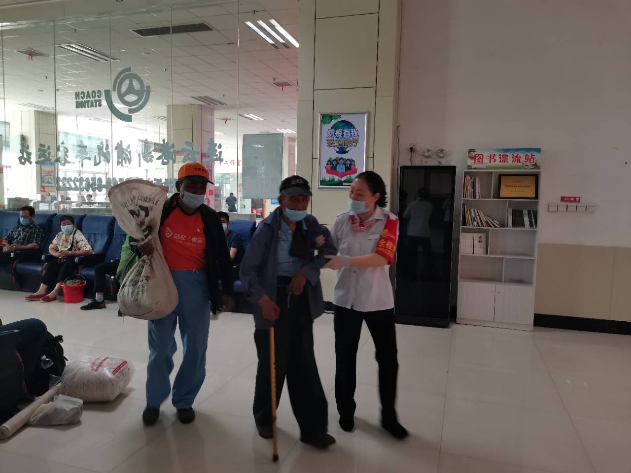 当广播提醒响起:“旅客们,你们好,请前往临沂方向的旅客到22号检票口检票上车,谢谢!”谈海燕立即小跑到检票口,一步步的把老人慢慢扶上车。在客车发车时,老人与她挥手告别。