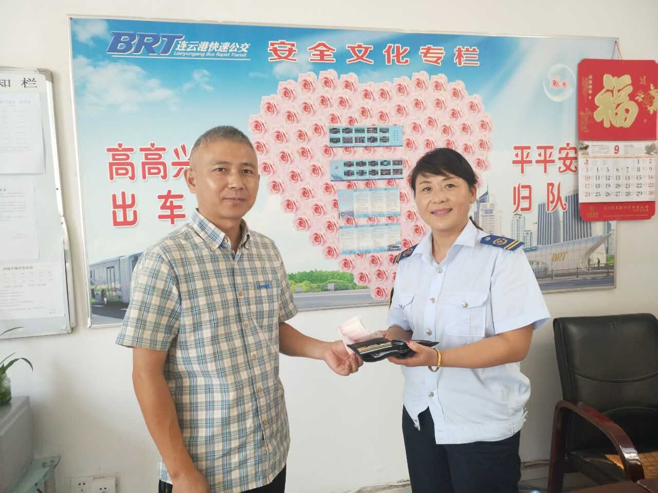 9月14日,公交集团快速公司B1夜班线驾驶员杨福连,在车厢内拾到价值2000元购物卡和800元现金,及时交于车队。18日,失主许先生领回钱包,表示感谢!