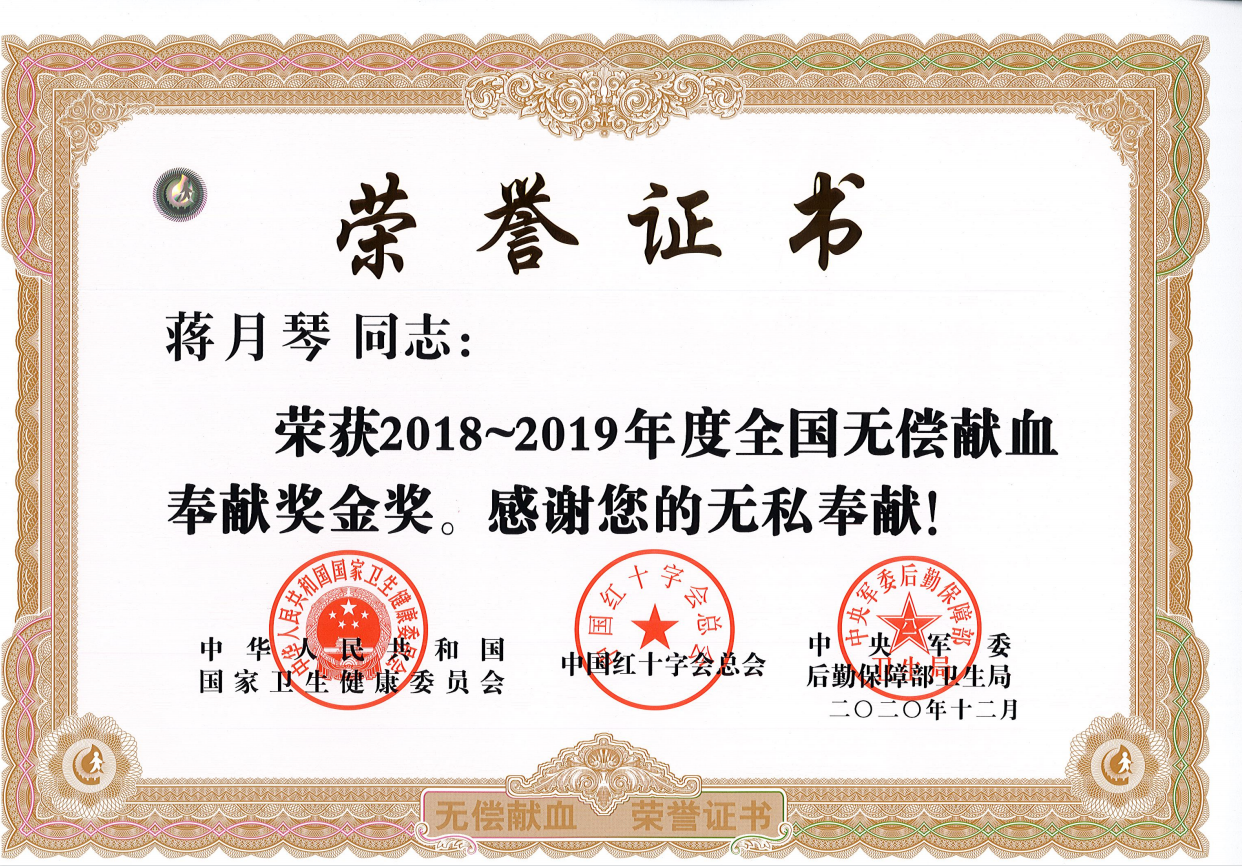 近日,市交通控股集团权属明茂公司蒋月琴同志荣获“全国无偿献血奉献奖金奖”。