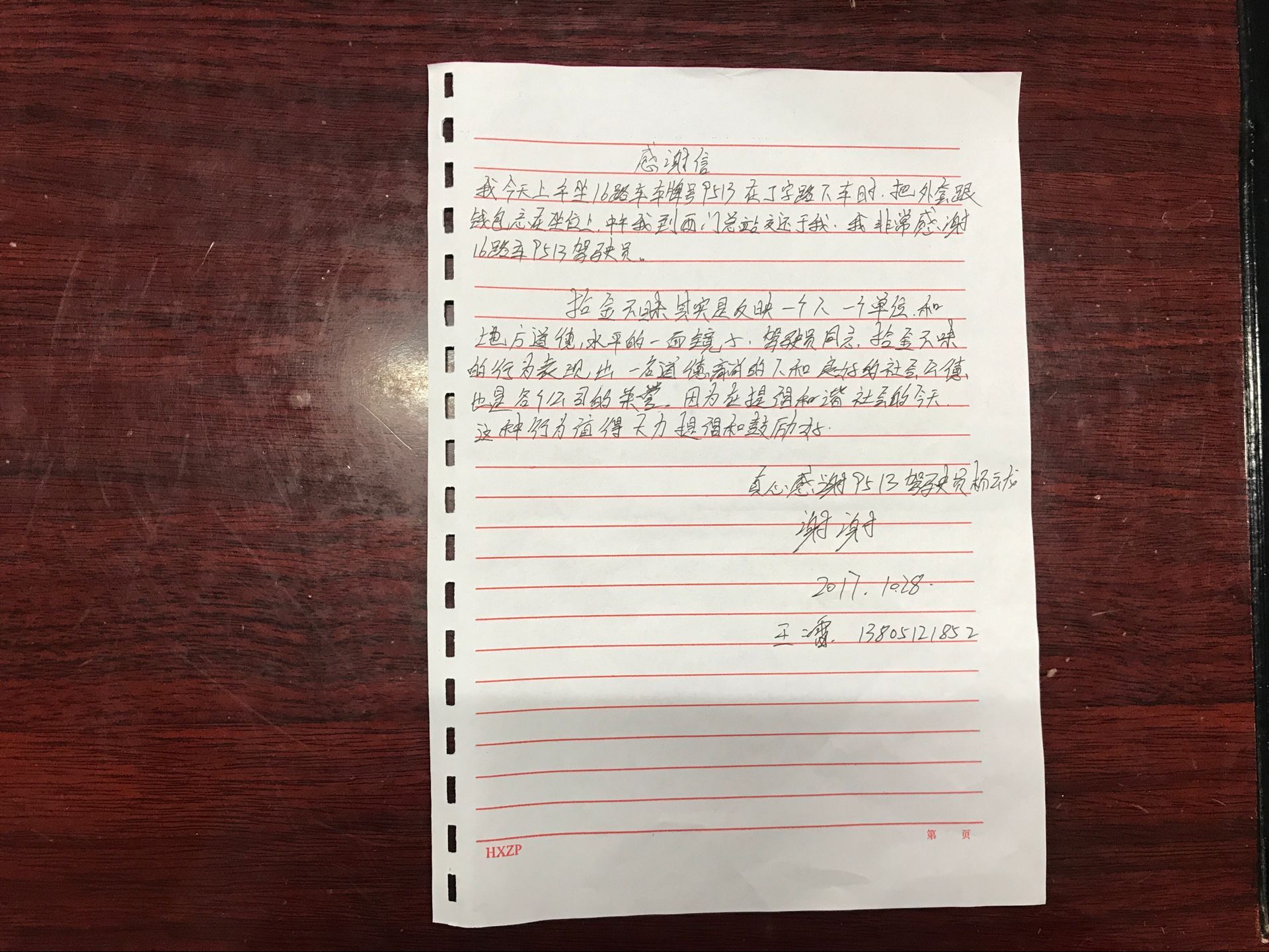 当王先生看到自己失而复得的外套时,握住杨师傅的双手十分激动连声感谢。原来王先生的钱包在外套里,钱包里内有身份证、现金3000多元、银行卡3张余额达到10万多元。他当时拿出100元现金答谢杨师傅,被杨师傅委婉拒绝。王先生当场写下一封感谢信,并一再表示感谢,感谢公交16路驾驶员杨云龙师傅拾金不昧、感谢帮助他的所有工作人员。