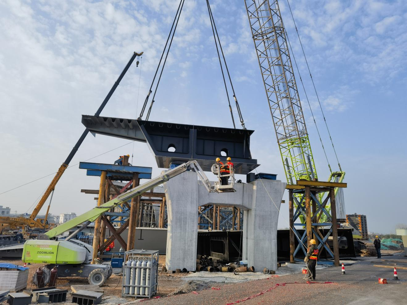 历经紧张的数小时,钢箱梁渐至5#桥墩上方,于微调中精准就位,第三联钢箱梁首次落位顺利完成。此次吊装成功,为项目后续合龙筑牢根基,助力项目向着通车目标大步迈进。