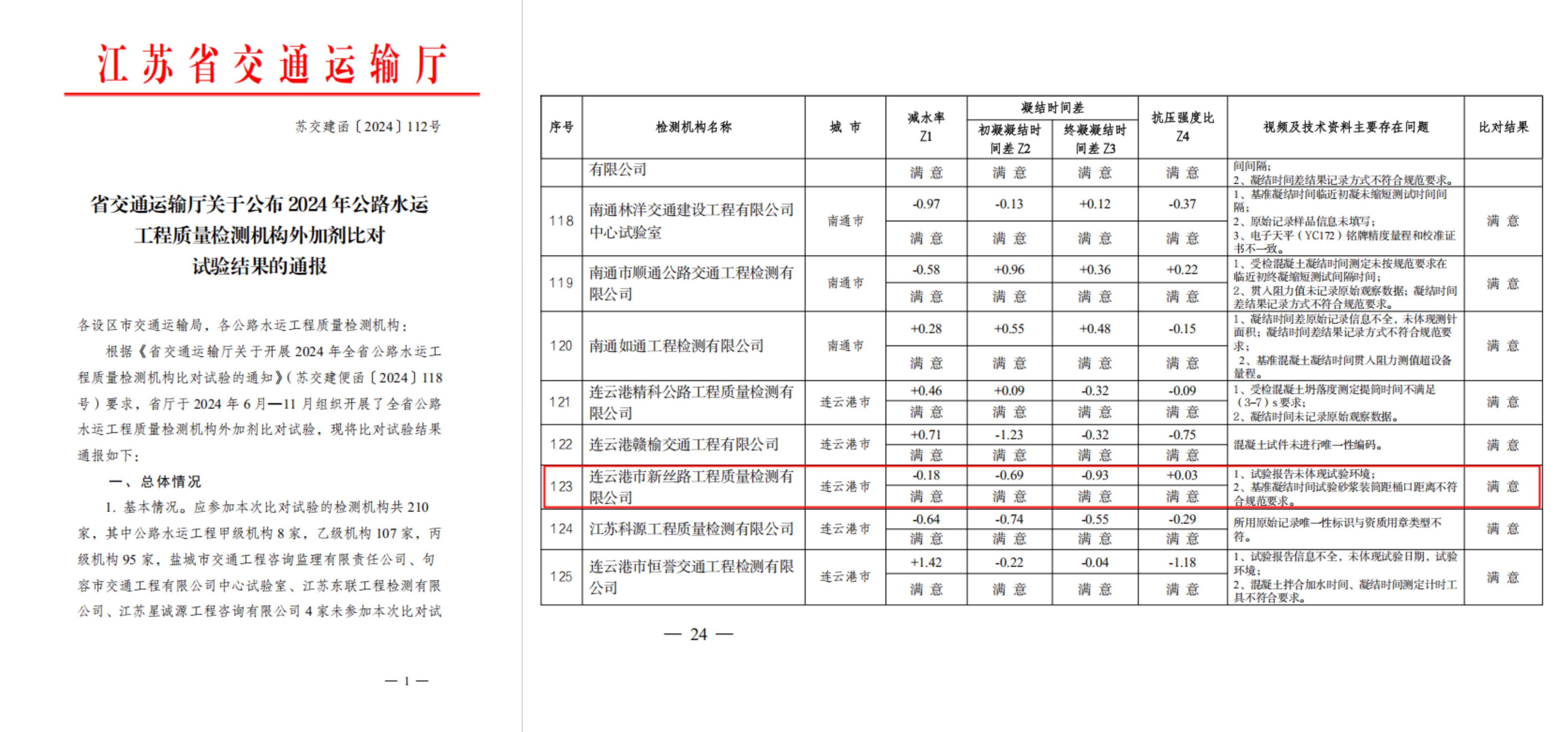 根据《省交通运输厅关于开展 2024 年全省公路水运工程质量检测机构比对试验的通知》(苏交建便函〔2024〕118号)要求,省厅于2024年6月—11月组织开展全省公路水运工程质量检测机构外加剂比对试验。近日,苏交建函〔2024〕112号发文通报,江苏海建新丝路公司在2024 年全省公路水运工程质量检测机构比对试验中所获比对结果为“满意”,顺利通过此次比对实验。