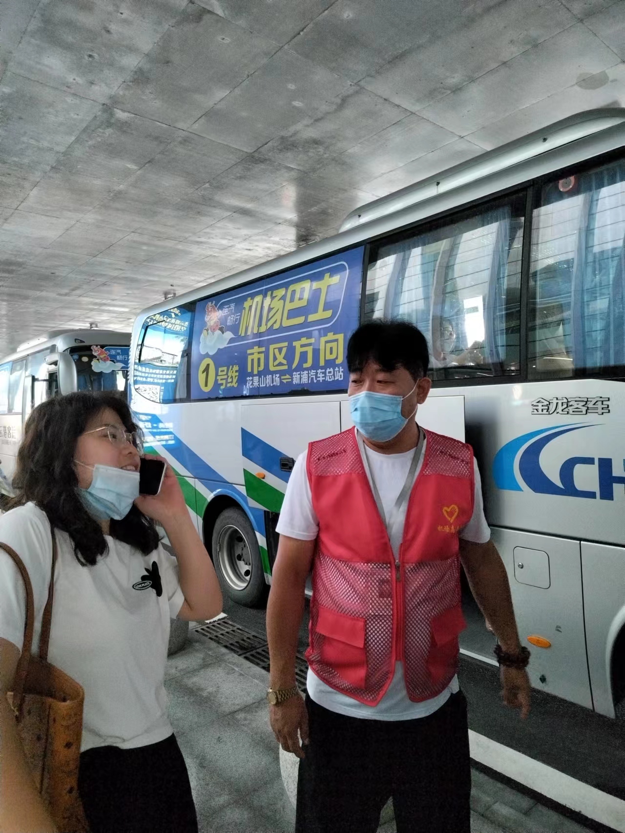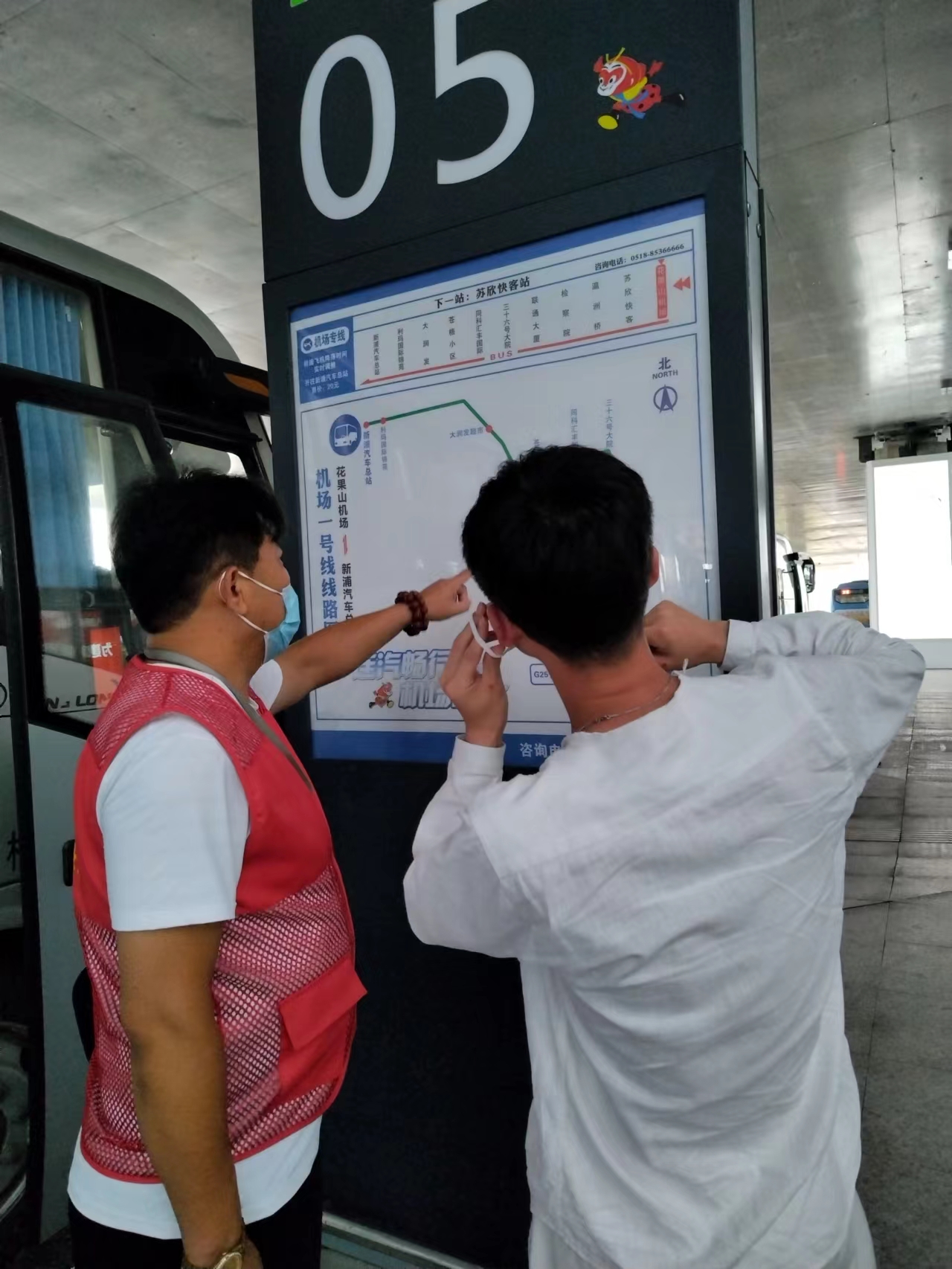 “您好!先生,机场巴士乘坐点在航站楼五号口,那个柱子上有明细的标识......”8月10号,在花果山机场航站楼,有一抹红色的风景线,他们是连汽新浦汽车总站(客运事业部)机场巴士的志愿者,他们穿着红马甲,正热情地为旅客们提供咨询、引导等服务。