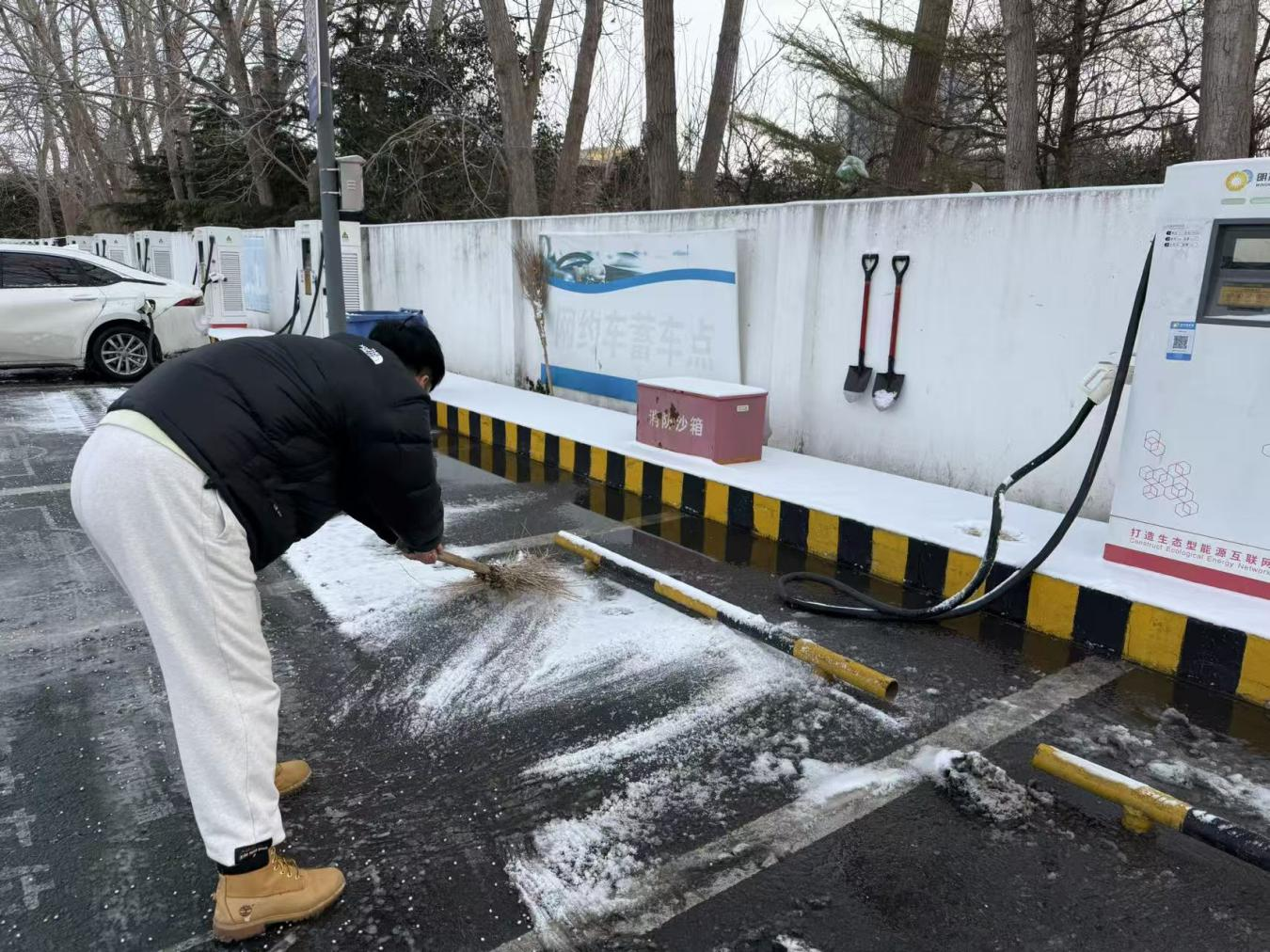 降雪伊始,明茂公司第一时间启动应急响应机制明确分工、调配工具,将铁锹、扫帚、推雪板等物资迅速分发到位。抵达现场后,大家迅速按照既定方案开展作业,合理划分清扫区域,重点对社会充电场站出入口、行车通道、停车位、充电桩周边及应急通道等关键区域进行全面清扫。