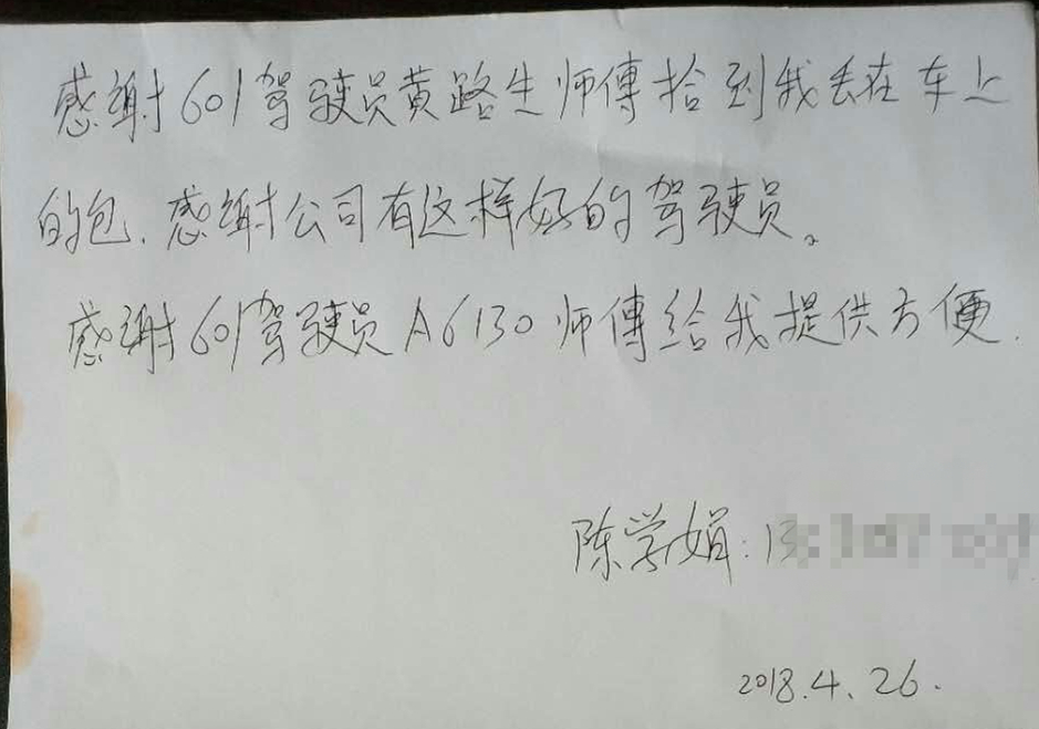 4月26日,乘客陈女士乘坐公交601路苏GA6120车时,因下车匆忙不慎将手包丢失在车上,公交集团东部公司驾驶员黄路生到站打扫卫生时发现手包并及时交到二分公司办公室,经过二分公司管理人员和驾驶员的多方努力,终于联系到失主并通知失主到二分公司领取包。陈女士来到二分公司,经核实身份后,二分公司经理把包归还给失主陈女士。陈女士领取包后,为表示对驾驶员黄路生师傅的感谢,当场写下感谢信,感谢驾驶员黄师傅拾金不昧的精神,感谢工作人员的热心帮助,同时感谢公交公司培养这种品质高尚的人!