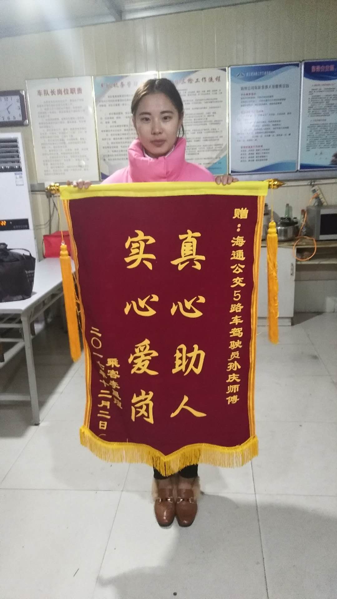 12月12日上午,公交集团海州公司党校调度室来了一位女士,手中拿一面锦旗,说这面锦旗是赠送给我们5路线驾驶员孙庆的。