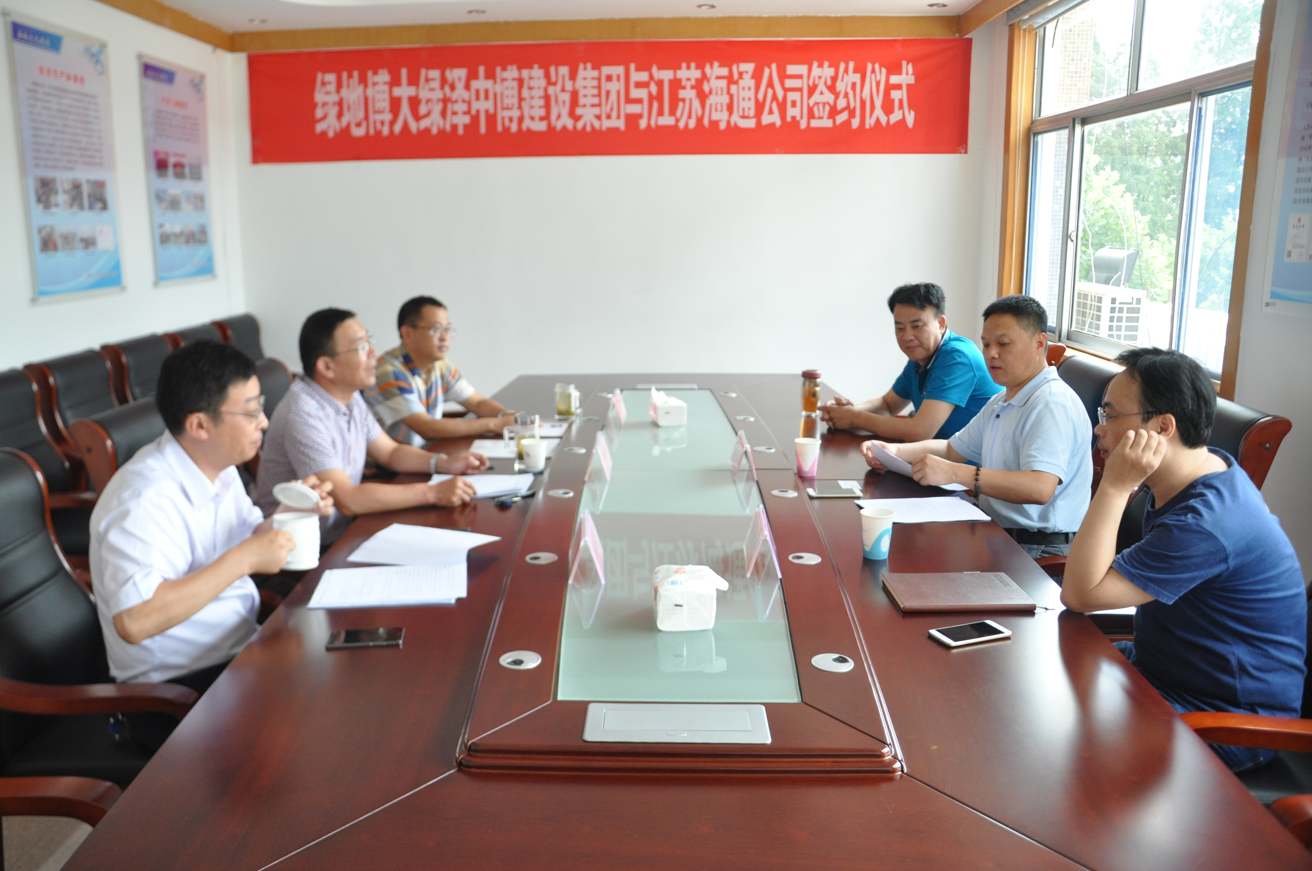 7月14日上午,绿地博大绿泽中博建设工程集团有限公司与江苏海通公司在海通公司机关总部举行战略合作框架协议签字仪式,绿地博大绿泽中博建设集团总经理曹永泰、江苏海通公司董事长茅红兵、总经理王梁洲、副总经理陈志文出席签约仪式。