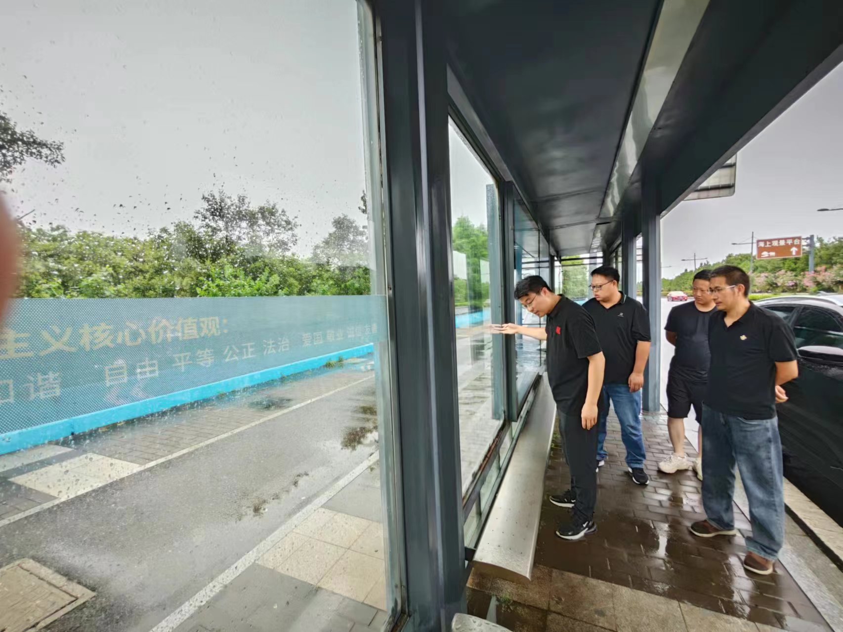 为积极应对台风“格美”,深入贯彻集团夏季高峰秩序整治暨汛期安全生产工作会议要求,切实做好恶劣天气风险隐患检查工作,7月27日,交通集团副总经理陆鑫带队深入公交站亭开展防汛防台风安全工作专项检查。交通置业建设运营部负责人及站亭养护单位陪同检查。