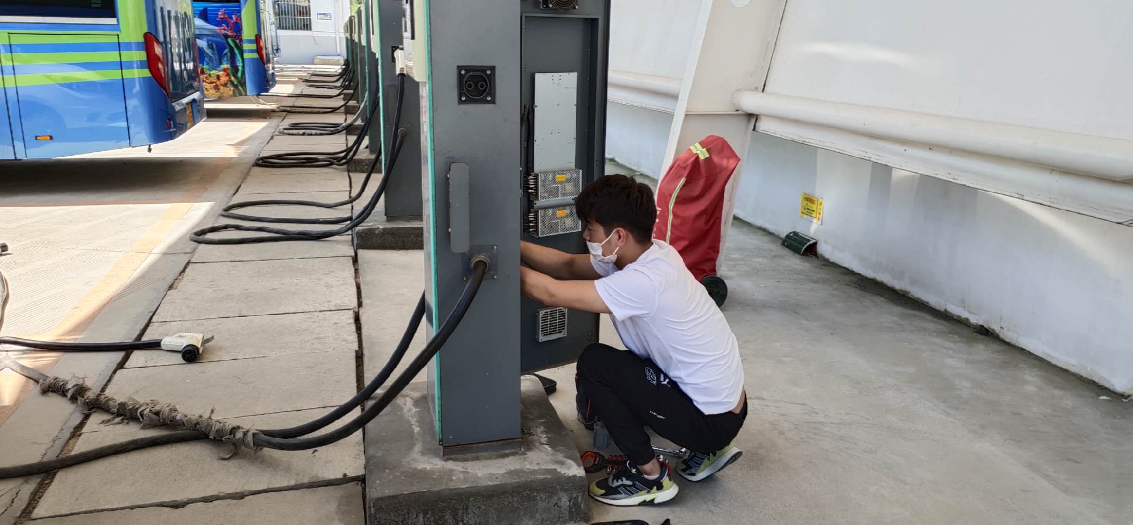 班长姜水清带领电工张孟到西城各个充电站点,检查充电桩的模块、显示器、设备间、配电房等各类安全部件是否符合规定,以及场站内安全设施,如灭火器、消防沙、安全手套等是否有效齐全。同时对当班充电人员进行安全叮嘱。特别强调:安全是重中之重,要求充电工在工作时一定要注重安全防护工作,密切观察充电桩的充电情况,要做到安全第一。