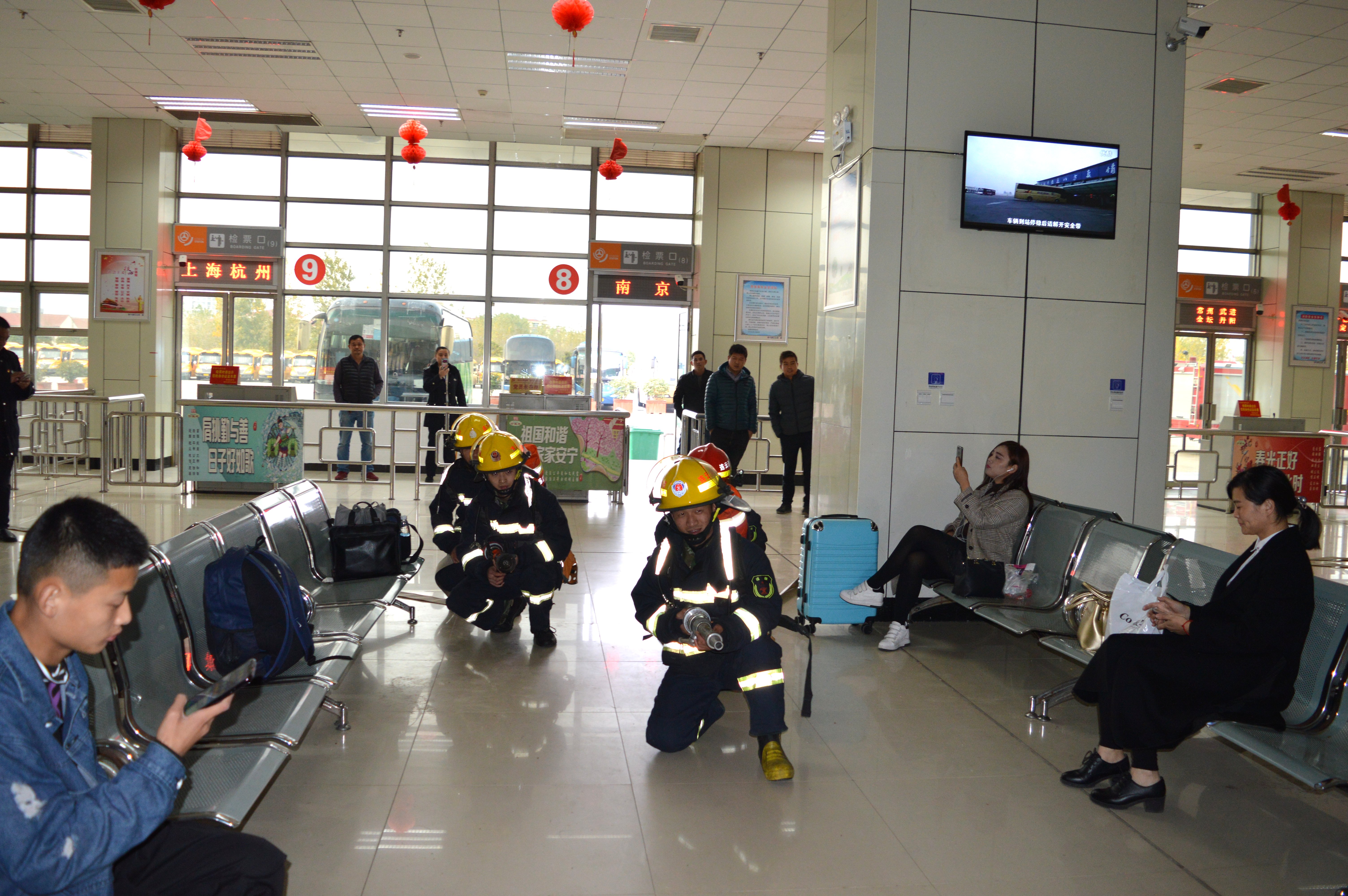 在灌云客运站的站内广场,参演的10余名消防员与20余名客运站员工在现场严阵以待,三台消防车有序停靠,消防战士们装备整齐,指挥员一声令下,公共场所消防演练正式开始。