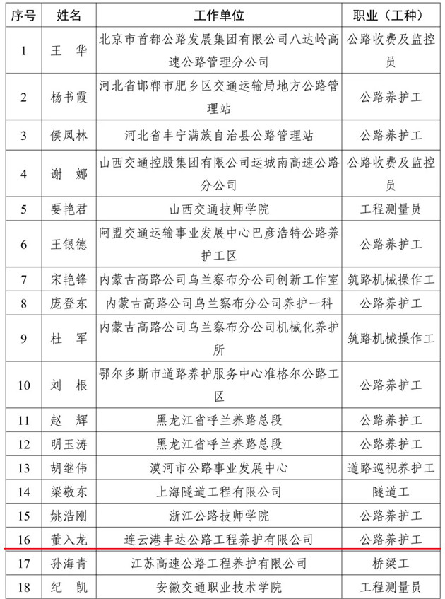 近日,交通运输部公布2021年度全国交通技术能手评审结果,连云港市交通控股集团丰达养护公司公路养护工董入龙同志荣誉“全国交通技术能手”称号。据悉,全国仅有245名同志获此荣誉。