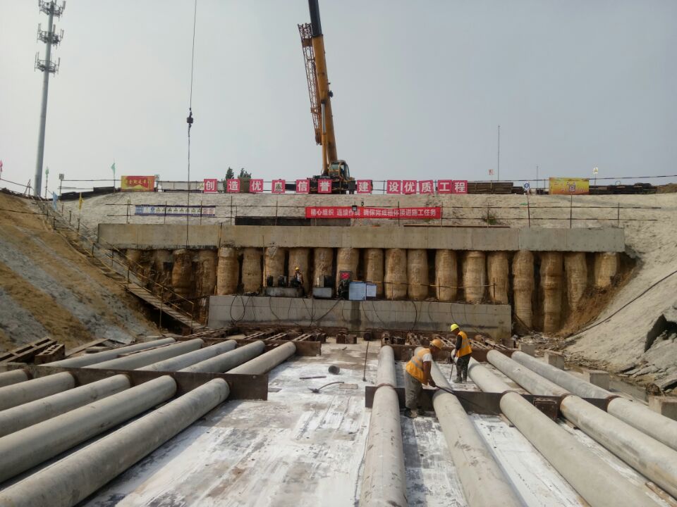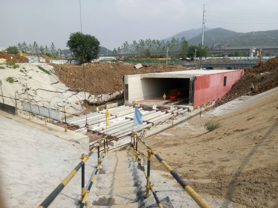 由中铁十四局承建的陇海线沙集道口平改立工程预制箱涵于24日上午九点进入下穿顶进陇海铁路线工序施工。据项目施工负责人介绍,该项目总造价1000余万元,箱涵预制完成后,养护了一个多月,经检验、检测合格后,进入下道工序顶推就位。预制箱涵总长42米,总重量3400余吨,用十二台专用液压油顶施工,正常情况下需要三至四天的时间顶推到就位点,届时将与海通公司项目部施工部分相对接。它的完成,将为加快整个陇海线沙集道口平改立工程竣工进程提供积极条件。这种施工方法,是上海铁路局为了不中断繁忙的陇海线运行,确保铁路运输安全的情况下制定的施工方案。