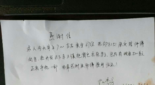 4月26日,乘客赵女士早上7:00左右乘坐公交37路苏GP8151车时,在开发区站下车,因下车匆忙不慎将背包丢失在车上公交集团东部公司,驾驶员朱庆培到站打扫卫生时发现该背包并及时交到二分公司办公室,经过二分公司管理人员和驾驶员的多方努力,终于联系到失主赵女士。赵女士领取自己丢失的背包时,感慨万千,她说,“原以为背包找不回来了,没想到在公交公司保存的这么好,太感谢驾驶员朱师傅了,太感谢你们了。”随后赵女士怀着一颗感恩的心当场写下感谢信,感谢驾驶员朱师傅拾金不昧的精神,感谢工作人员的热心帮助!