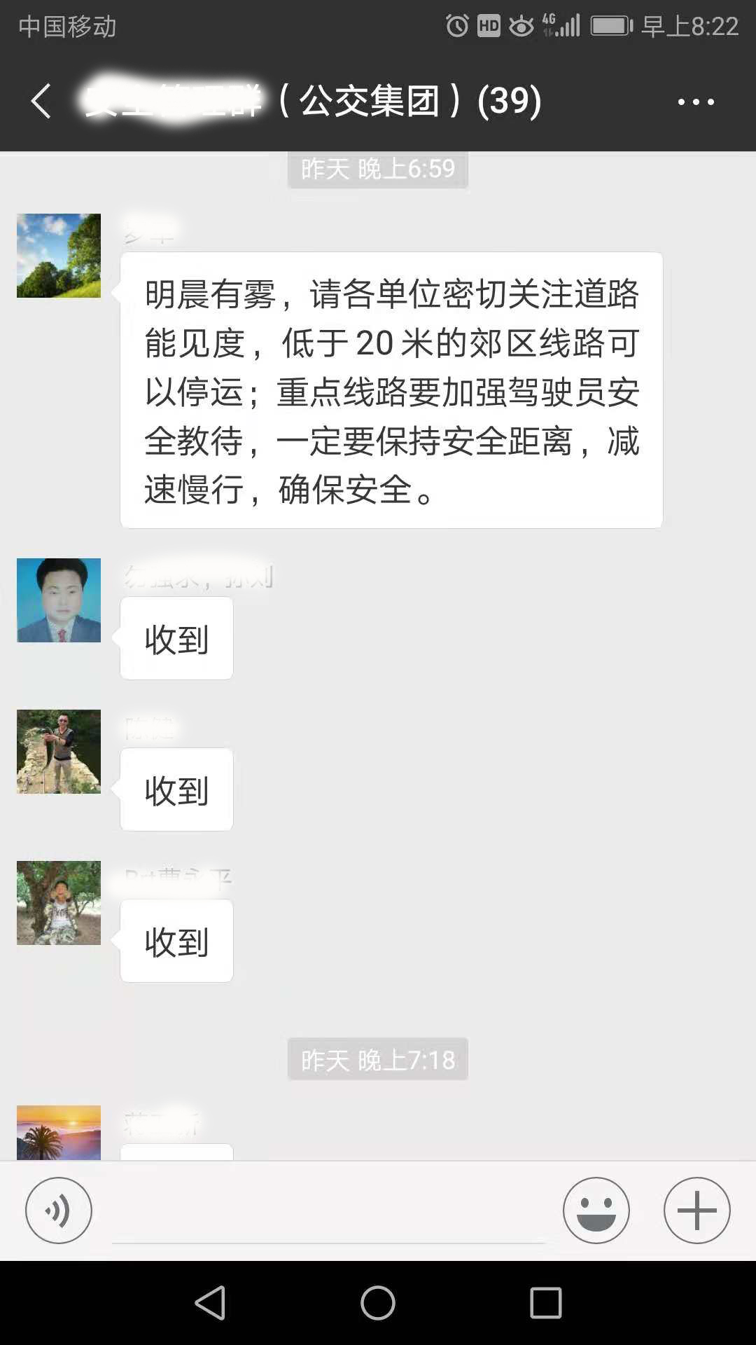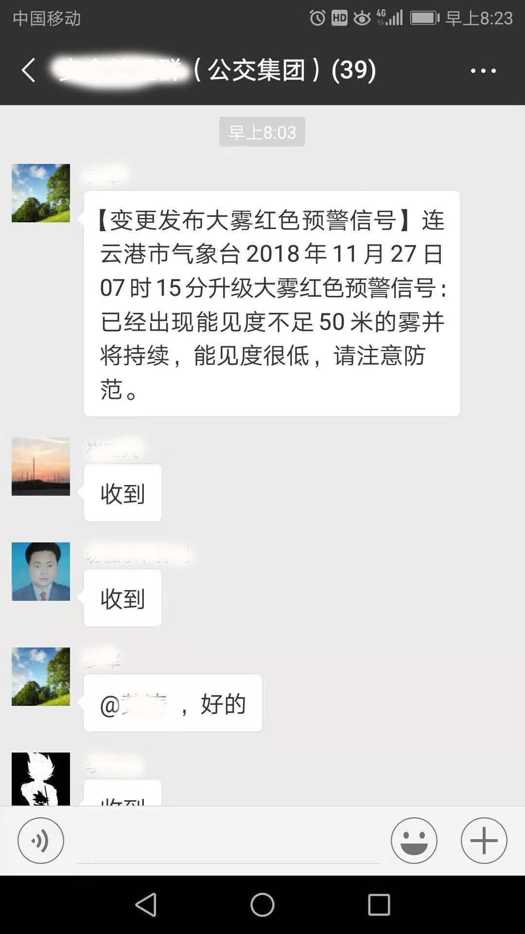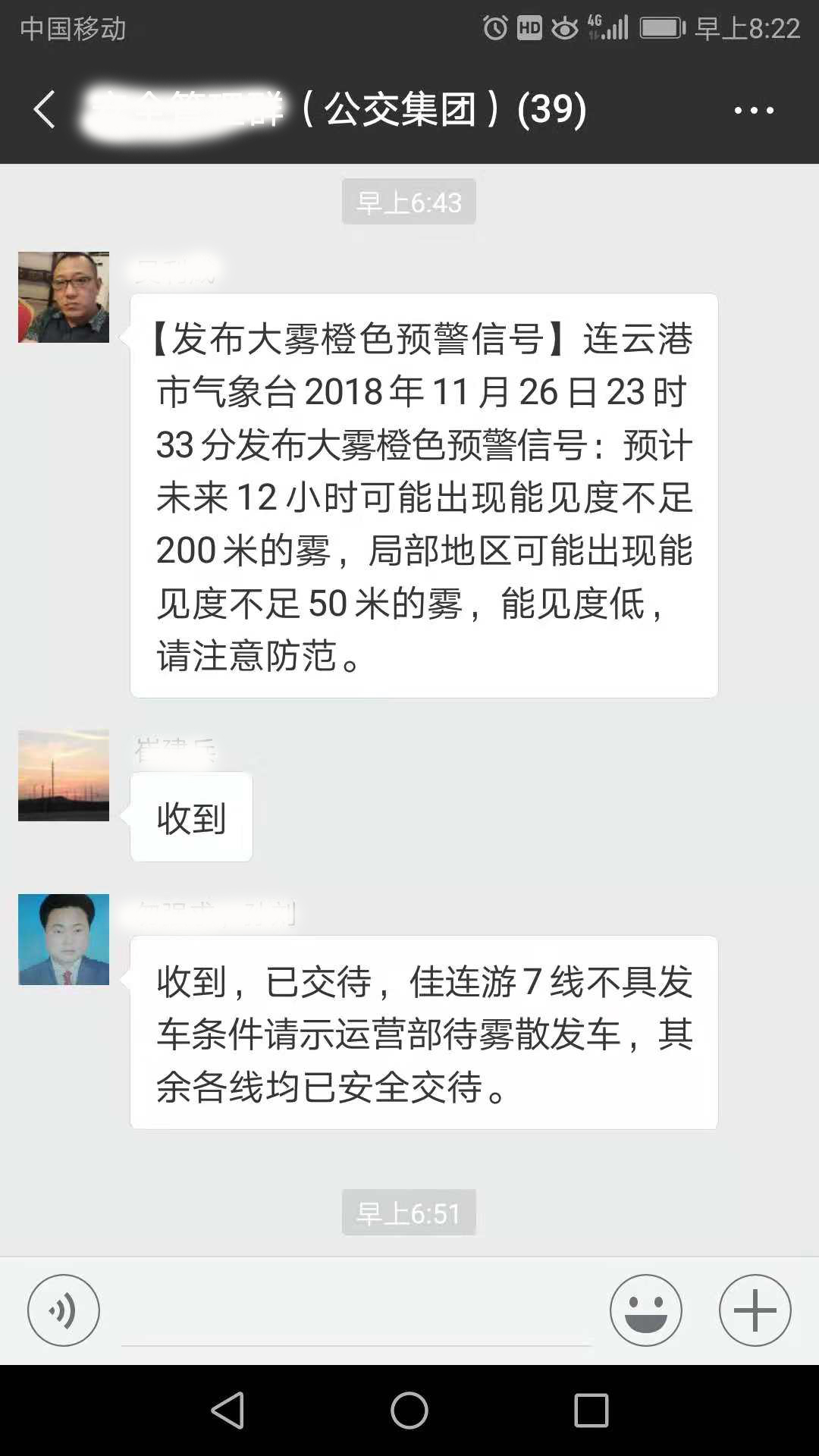 除了连云港,全省也都笼罩在大雾中。能见度低给广大出行的人带来极大的麻烦,公交集团立即启动紧急行车预案,集团各权属单位根据实际运营路线情况积极采取措施,从监督驾驶员安全出车,对驾驶员进行大雾天气安全行车提出要求,对驾驶员进行安全交代等方便做好大雾天气安全行车准备工作。