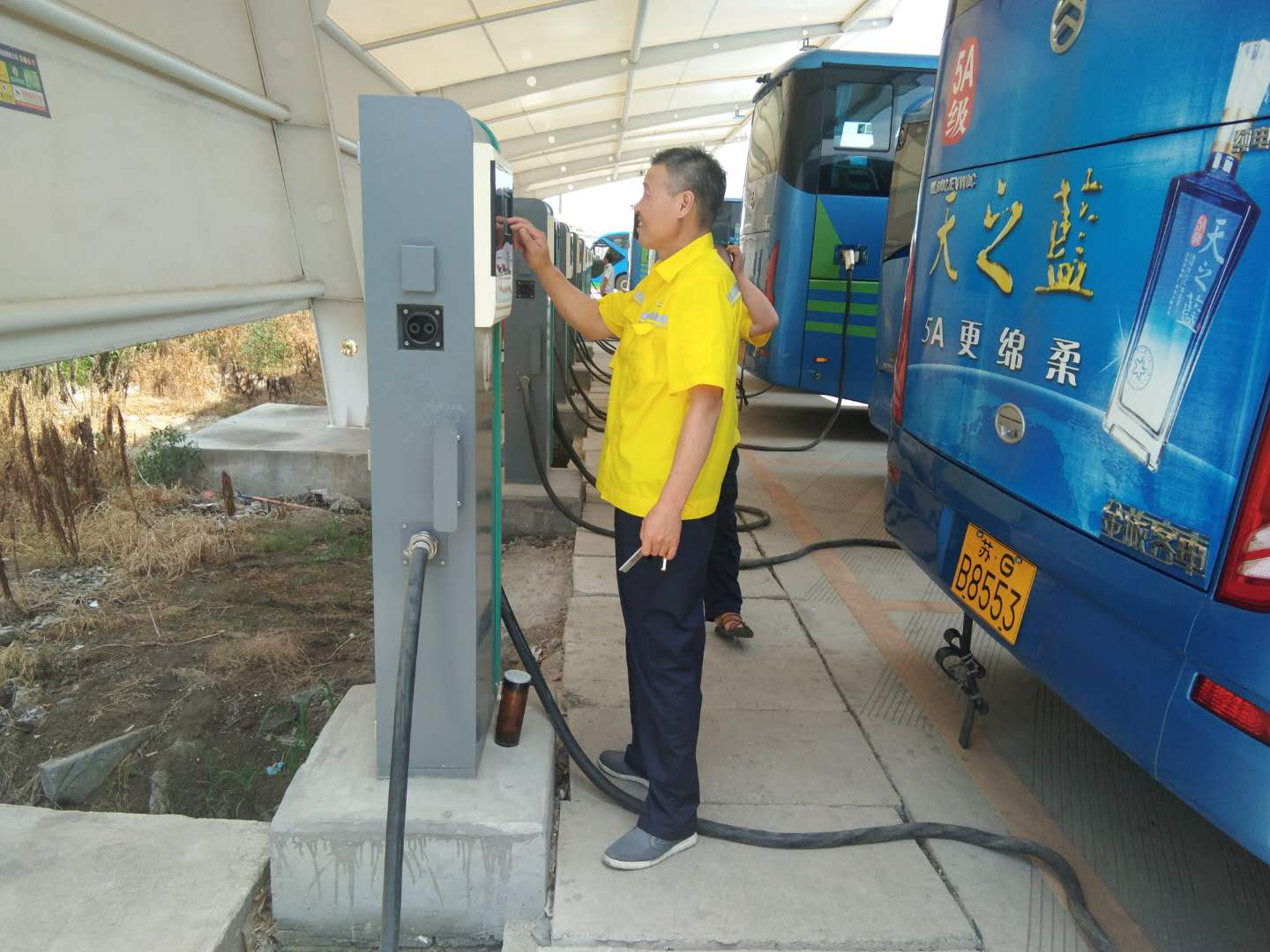 江化北路充电场站目前有10个充电桩,每天来这上班的充电工最大年龄59岁,平均年龄都在55岁以上,但是他们年岁虽老而心志犹壮,一年四季顶着烈日严寒在室外工作,早上6点到岗,夜里24点下班,没有舒适的座椅,没有凉爽的风扇,每天面对单调,重复,枯燥的工作挥洒汗水,或许他们一身的汗味,没有人愿意靠近,但他们却从不言苦,不言累,而是凭着对工作的热爱,传承着爱岗敬业的精神,他们为了让更多的人能够及时坐上公交车平安出行,每天一如既往地坚守在充电站,尽职尽责,为新能源公交车补充电量。他们的工作服干了又湿,湿了又干,他们的肤色黑了一层,脱了一层,远看像关公,近看才是充电工。但是他们,却用久经“烤”验的行动在诠释自己,他们在为公交车充电,同时也在为自身“充电",他们几个人的心往一处想,劲往一处使,平时他们认真学习公司的规章制度,提高自己的职业道德和技术技能,定时巡查设备运行是否正常,利用充电空隙时间清扫场地,从未因为个人原因而影响工作和机器的正常运行,遇到突发情况他们也是想方设法排除。