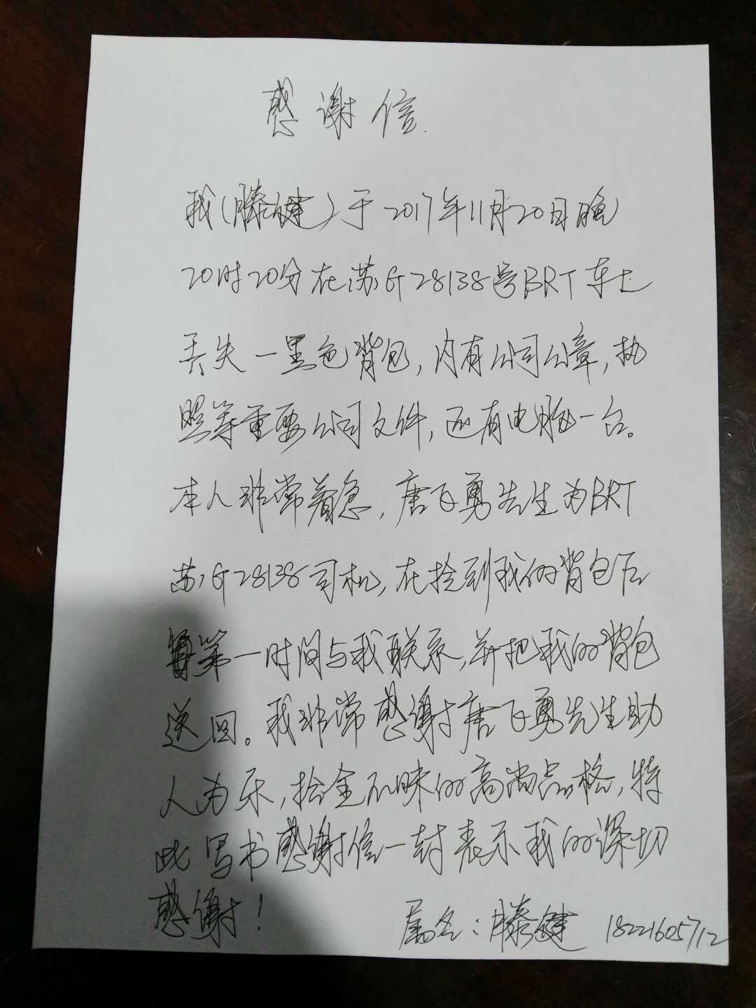11月20日晚上20点20分,滕先生乘坐车号为苏G-28138的B1线车,在在海一方站下车时,不慎将一个黑色背包丢失在车上,包内有笔记本电脑一台,还有公司公章、执照等重要公司文件,当时滕先生非常着急。20点41分,驾驶员唐飞勇车在加气站加气时,无意中发现车厢里一个背包,并通过包内的名片顺利联系上失主滕先生,“唐师傅在捡到我的背包后,第一时间与我联系,并把我的背包送回。”滕先生说道。晚上9点,在东区车队调度室,滕先生从唐师傅手中顺利接过装有电脑的背包,“我非常感谢唐飞勇先生助人为乐,拾金不昧的高尚品格,特此写感谢信一封表达我的谢意。”滕先生在感谢信中写道。