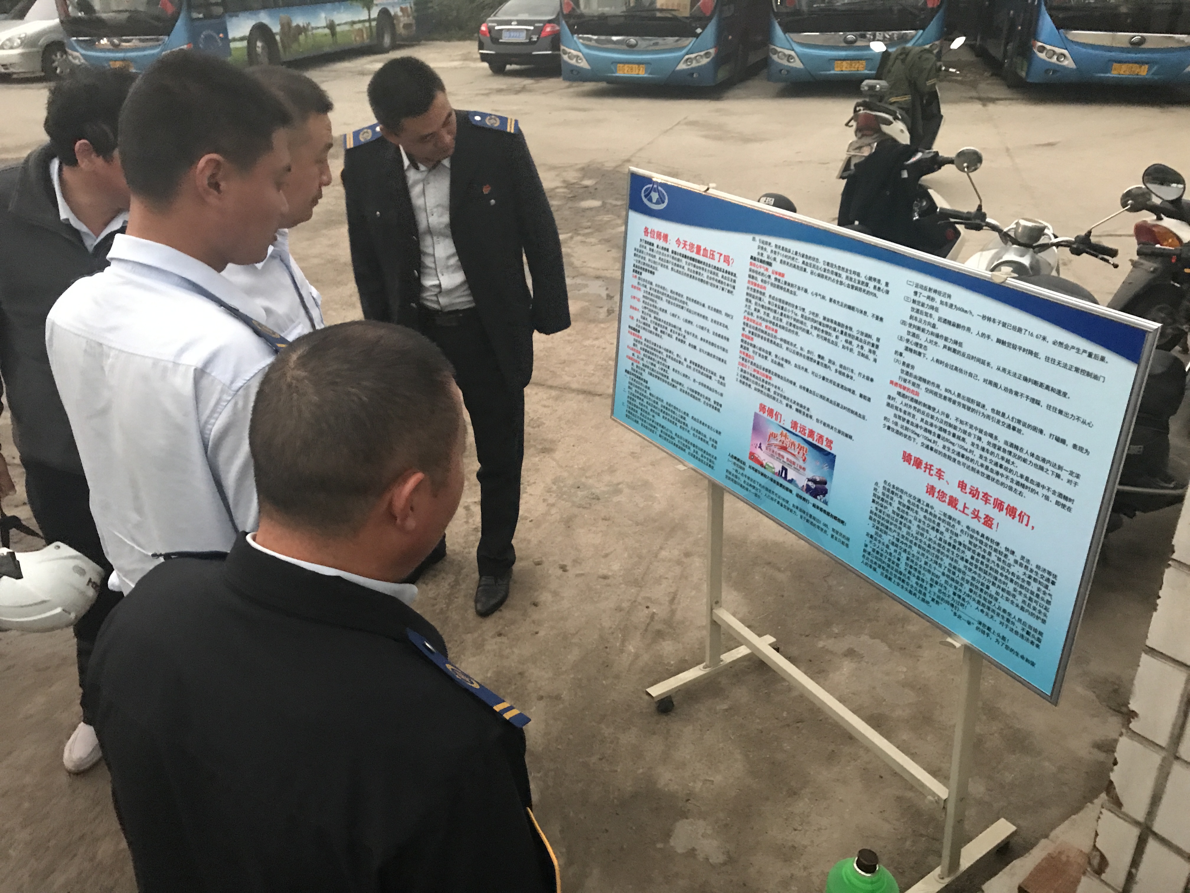 安全部门主要针对车内安全设施、驾驶员证件携带及一日三检完成情况进行检查,同时安排两名安全员对出车驾驶员测量血压及检测酒精,杜绝驾驶员带病行车及隔夜酒驾的行为发生。机务部门主要针对车辆发动机舱、灯光进行检查,确保不论燃气车辆或是电动车辆发动机舱干净整洁。当前已进入深秋,入夜较早,且雾天相对较多,加强对车辆灯光的检查及时排除隐患,杜绝因车辆灯光不良造成事故隐患。运营部门主要针对驾驶员着工装情况、车辆内外卫生及车辆标识标贴进行检查,确保车辆干净整洁,杜绝脏车出场。