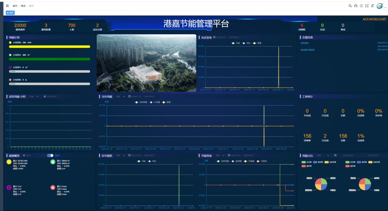 平台核心亮点之一——数据大屏模块,该模块以直观、生动的形式展示能源概览、节能效益、用能结构、用能曲线及光伏发电量等关键数据,使用户能够一目了然地掌握项目能耗全貌,从而精准施策,提升能效。