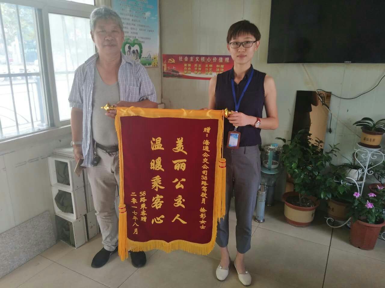 9月7日下午,新海连大厦的蒋秋雨女士将一面锦旗送到了公交东部公司一车队,表达她对58路公交车驾驶员徐影同志的感谢。