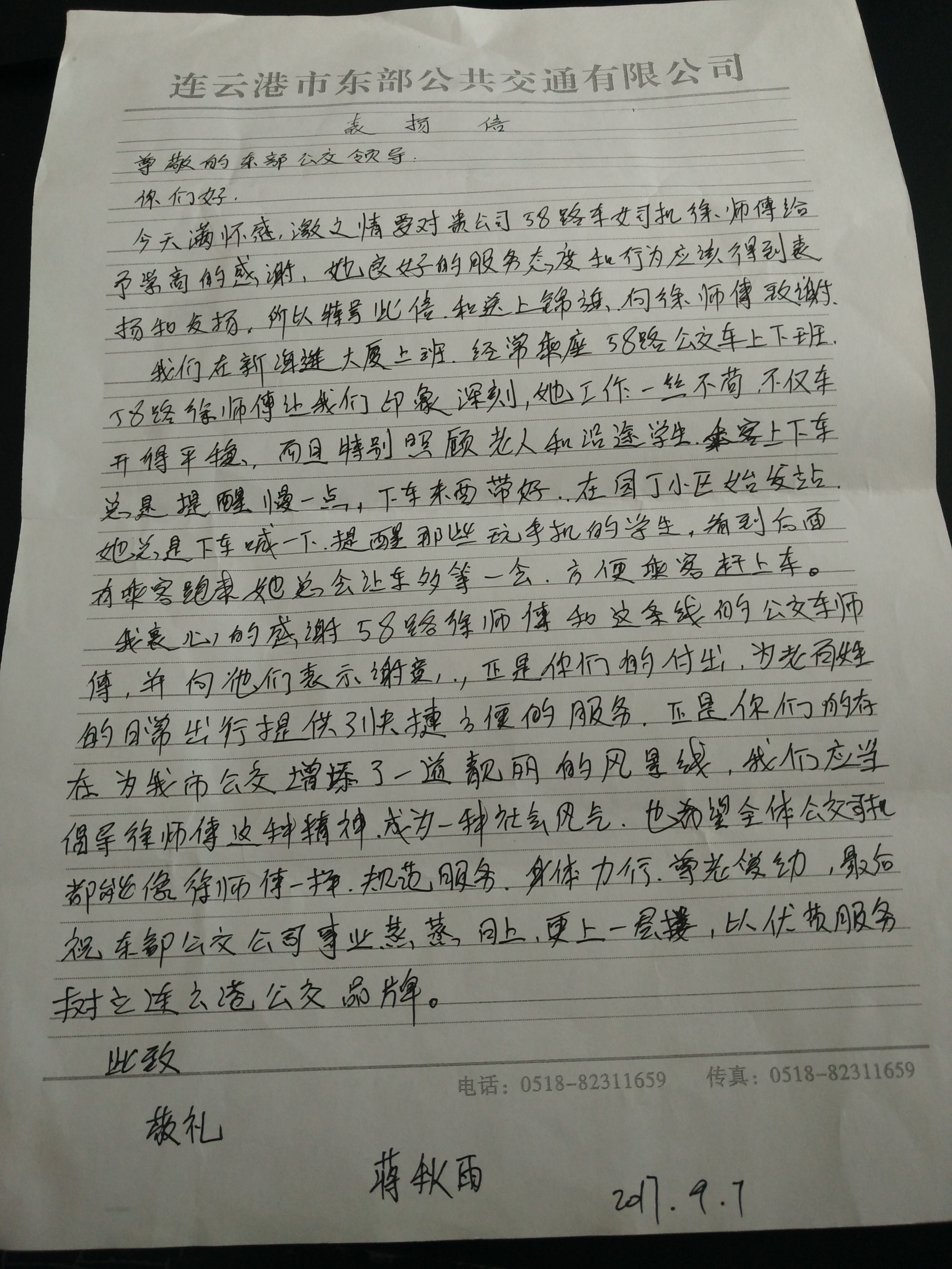 送锦旗时,蒋女士激动地说:“我每天打的去新海连大厦上班要花20多元,还是坐公交划算。58路驾驶员徐影师傅服务非常体贴、周到,天天如此。有时候到园丁小区公交站乘车,在还未到站的情况下招手示意,徐师傅看到后总会停在原地等候。为感谢徐师傅这种为他人着想、热心服务、爱岗敬业的优秀品质和职业精神,我一定要送这面锦旗。”徐影接过锦旗感动地说:“我只是做了自己的本职工作,乘客坐得舒服了,我也就舒心了。作为一名公交司机,我应该做到安全行车,用心服务。”送了锦旗后,蒋秋雨女士还特意写了封感谢信,感谢徐影及整条58路公交线驾驶员的热心服务。