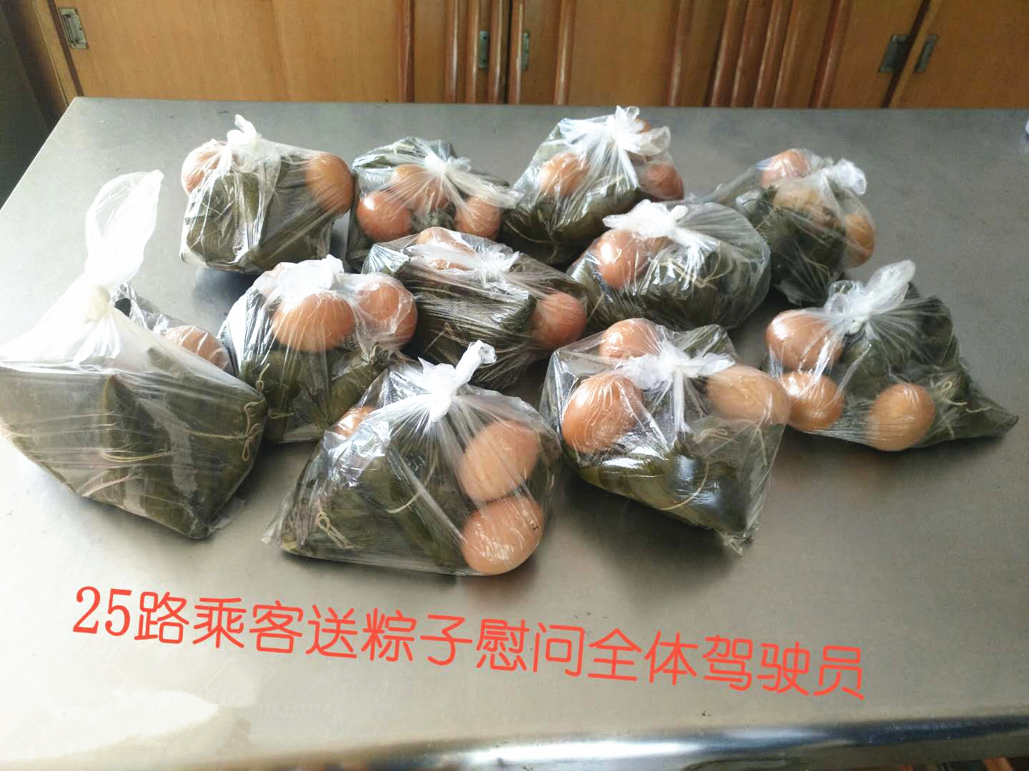 “五一”小长假期间,公交集团海通公交公司25路全线驾驶员收到了一份特殊的礼物——充满谢意的粽子和鸡蛋。