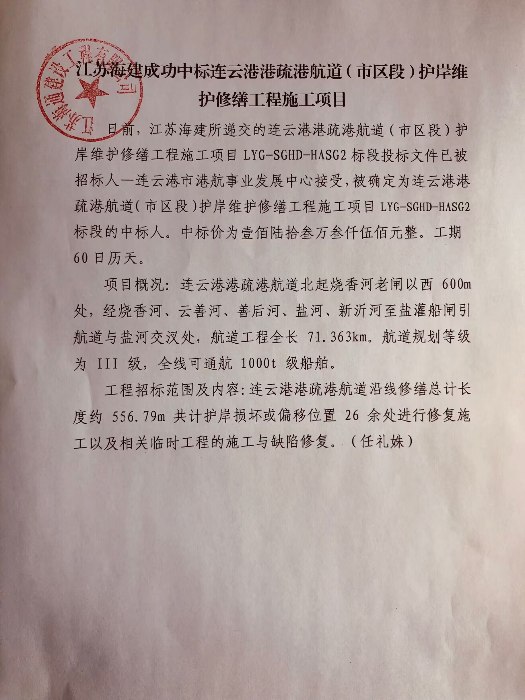 日前,江苏海建所递交的连云港港疏港航道(市区段)护岸维护修缮工程施工项目LYG-SGHD-HASG2标段投标文件已被招标人—连云港市港航事业发展中心接受,被确定为连云港港疏港航道(市区段)护岸维护修缮工程施工项目LYG-SGHD-HASG2标段的中标人。中标价为壹佰陆拾叁万叁仟伍佰元整。工期60日历天。