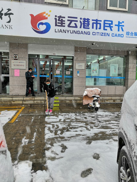 12月29日上午,连云港气象台发布暴雪黄色预警信号,预计未来24小时内,连云港部分地区将出现12小时1-4毫米左右的降雪。受持续降温大雪天气的影响,大部分路面积雪结冰,市民出行困难,因此,市民卡公司积极应对极端天气,为前来办理业务的顾客清扫一条无障碍之路。