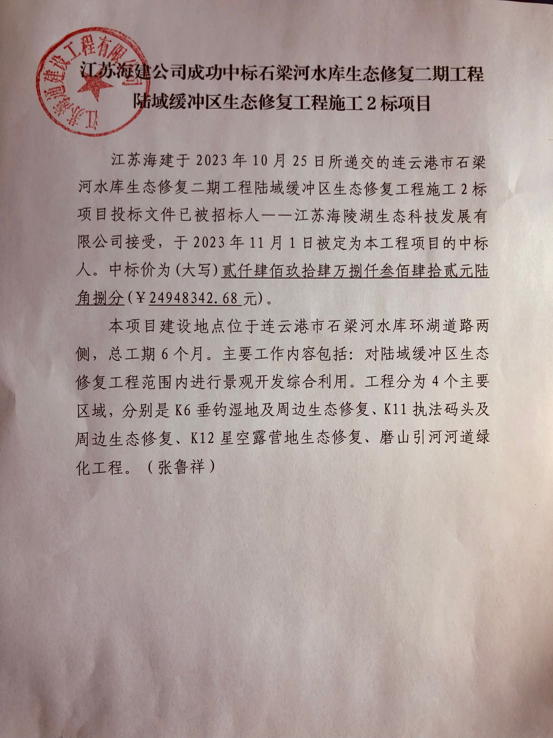江苏海建于2023年10月25日所递交的连云港市石梁河水库生态修复二期工程陆域缓冲区生态修复工程施工2标项目投标文件已被招标人——江苏海陵湖生态科技发展有限公司接受,于2023年11月1日被定为本工程项目的中标人。中标价为(大写)贰仟肆佰玖拾肆万捌仟叁佰肆拾贰元陆角捌分(¥24948342.68元)。