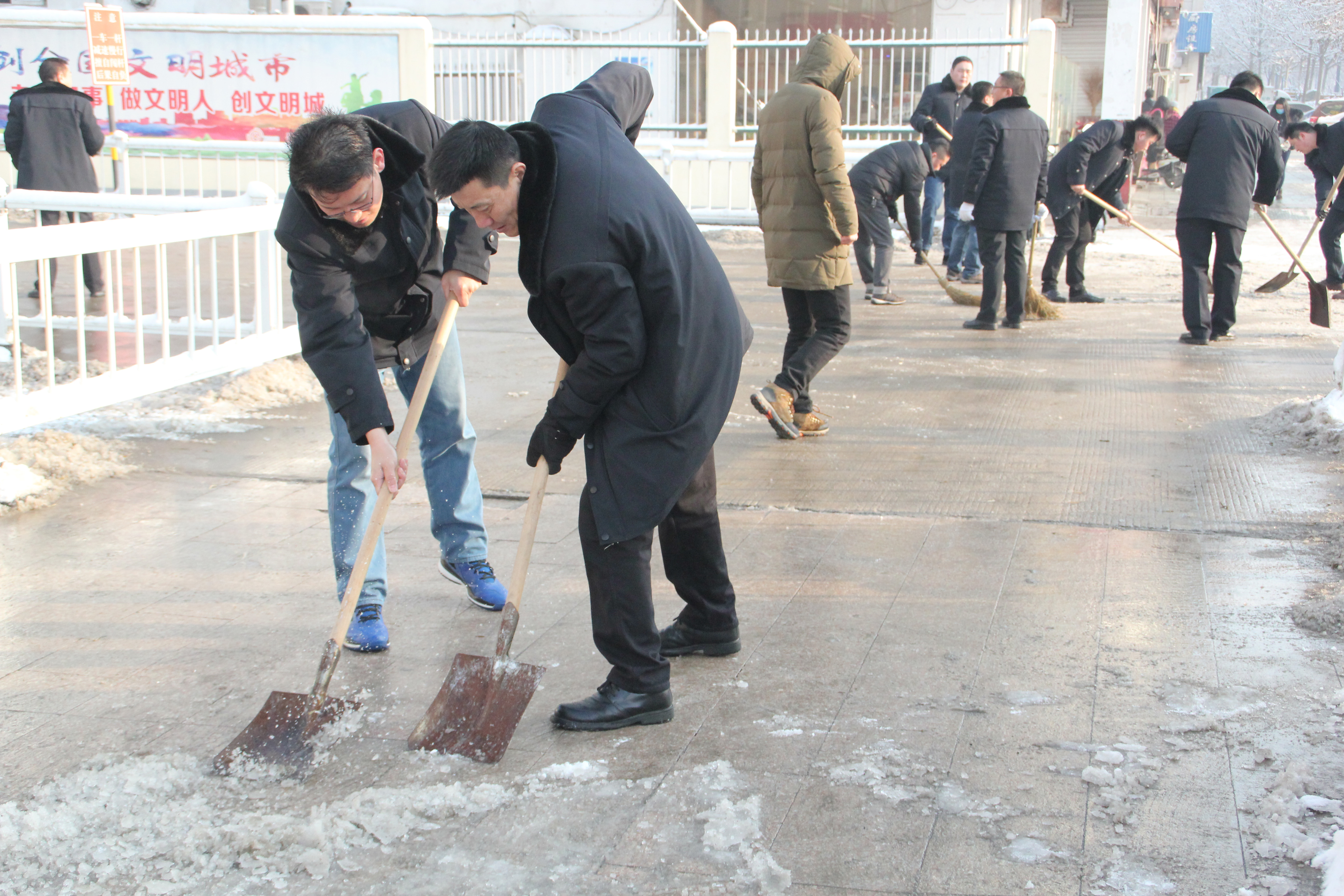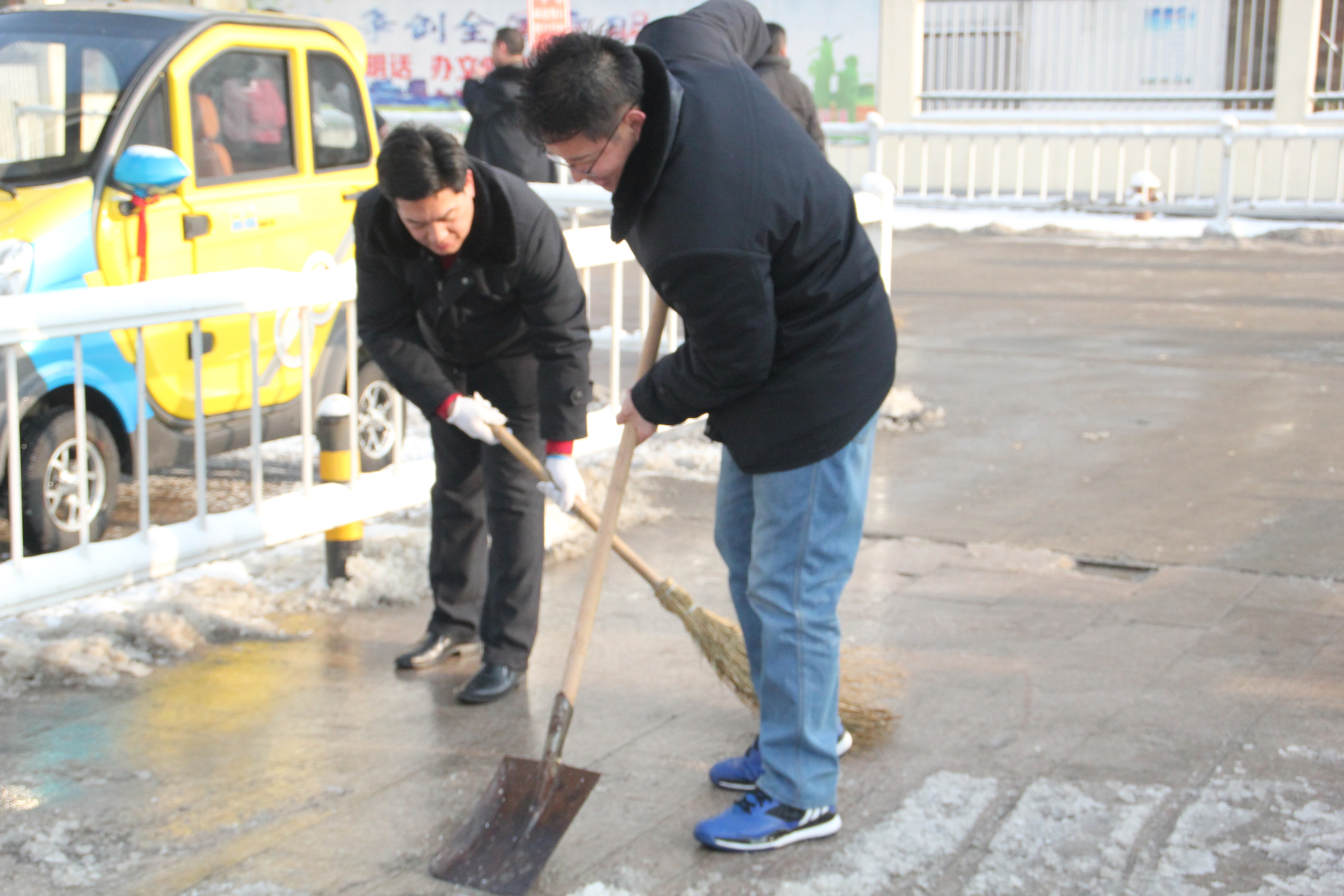 参加清扫积雪的人员冒着寒风、不顾寒冷,分工合作。有的拿铁锹、有的拿扫帚,积雪松的地方用推雪板推,积雪压实的地方就用铁锹一点点的铲除。大家干的热火朝天,进过近两个小时的劳动,进出车站的通道、二楼发车平台和站前广场等地段的积雪被清理得干干净净。