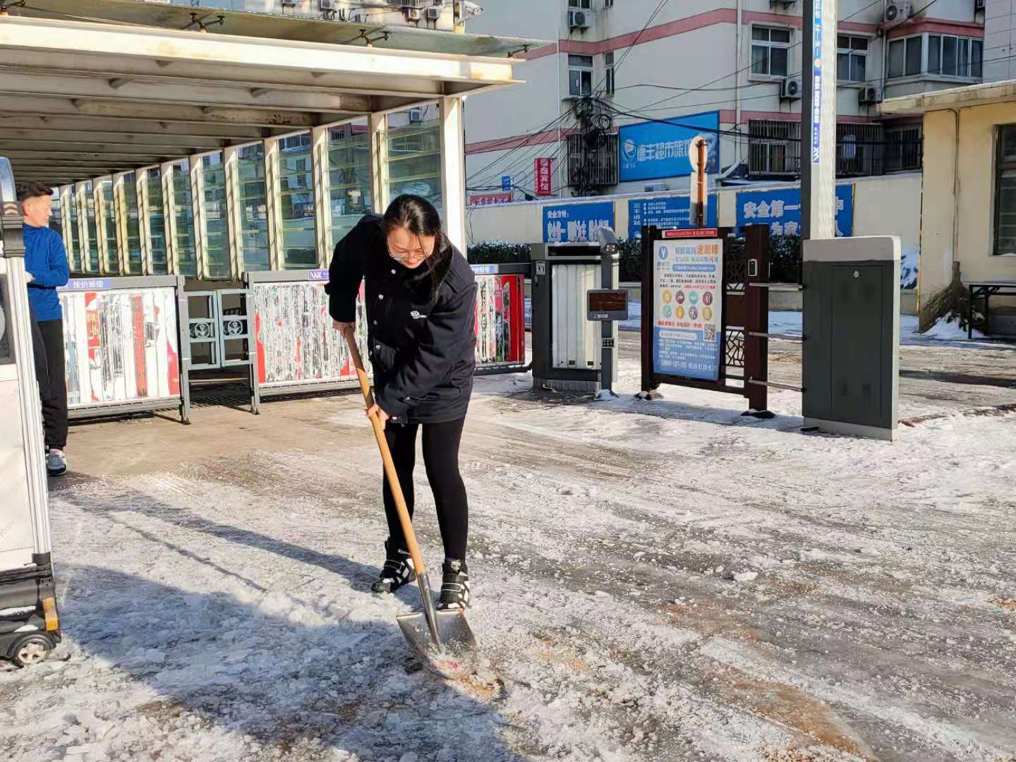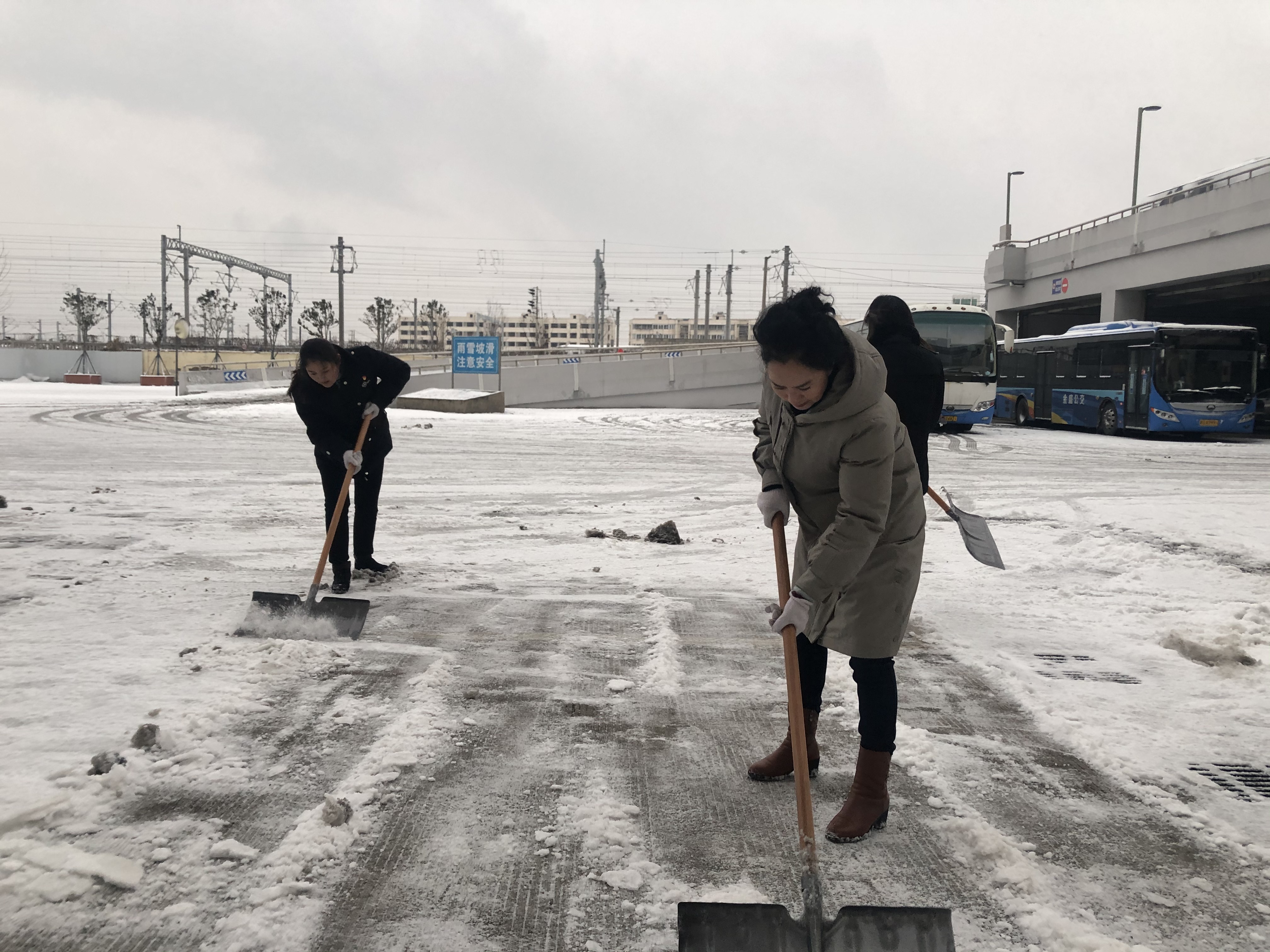 虽然室外气温很低,许多人的手和脸也被冻得通红,然而,这一切丝毫没有影响大家的劳动热情和效率。职工们团结协作、井然有序,挥舞着铁锹和笤帚,铲的铲、扫的扫,干得热火朝天,形成了一道美丽的风景线!经过大家的两个多小时的努力,将车场、发车区、进出站口等区域的积雪清理得干干净净。