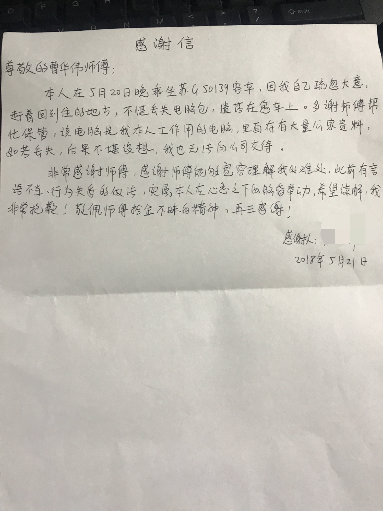 5月21日一大早,快客公司副经理姜永中就收到市民贾师傅的感谢信。