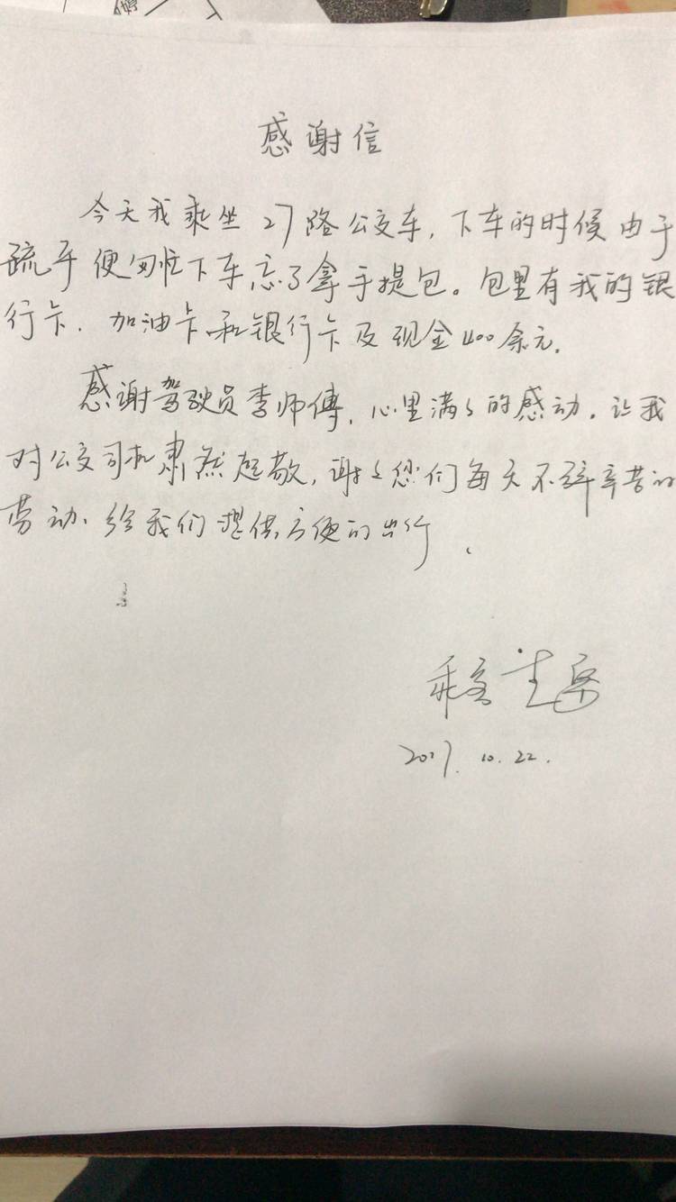10月21日,驾驶员李啸打扫车厢卫生时发现车后座有一只黑色男士手提包,李师傅立刻将手提包保管起来,车辆开回停车场后,第一时间将包交给了车队工作人员。车队几位工作人员想通过包里的信息找到失主,将包归还,于是打开包,包里装有公交卡、加油卡、银行卡和少量现金,车队人员通过加油卡客服联系上了失主王先生。