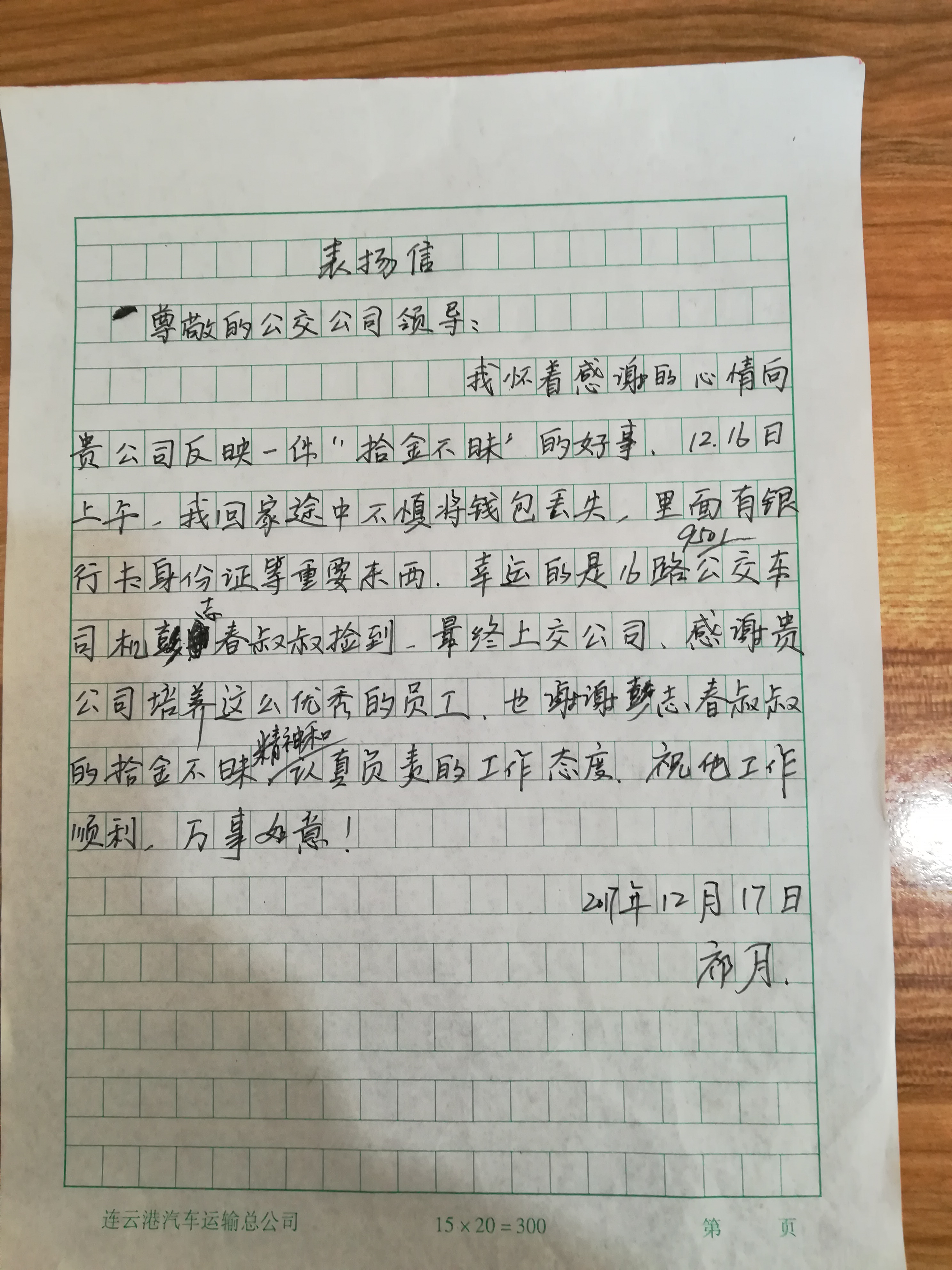第二天祁女士来到西门调度室,经过工作人员的信息核实终于找到了自己丢失钱包。当时十分激动,没想到自己丢失的钱包能够原封不动的归还到自己的手上。连声对驾驶员彭师傅表示感谢,并当场写下了一封感谢信,感谢公交公司能够培养出这么优秀的员工,也感谢彭师傅拾金不昧的精神和认真负责的工作态度。