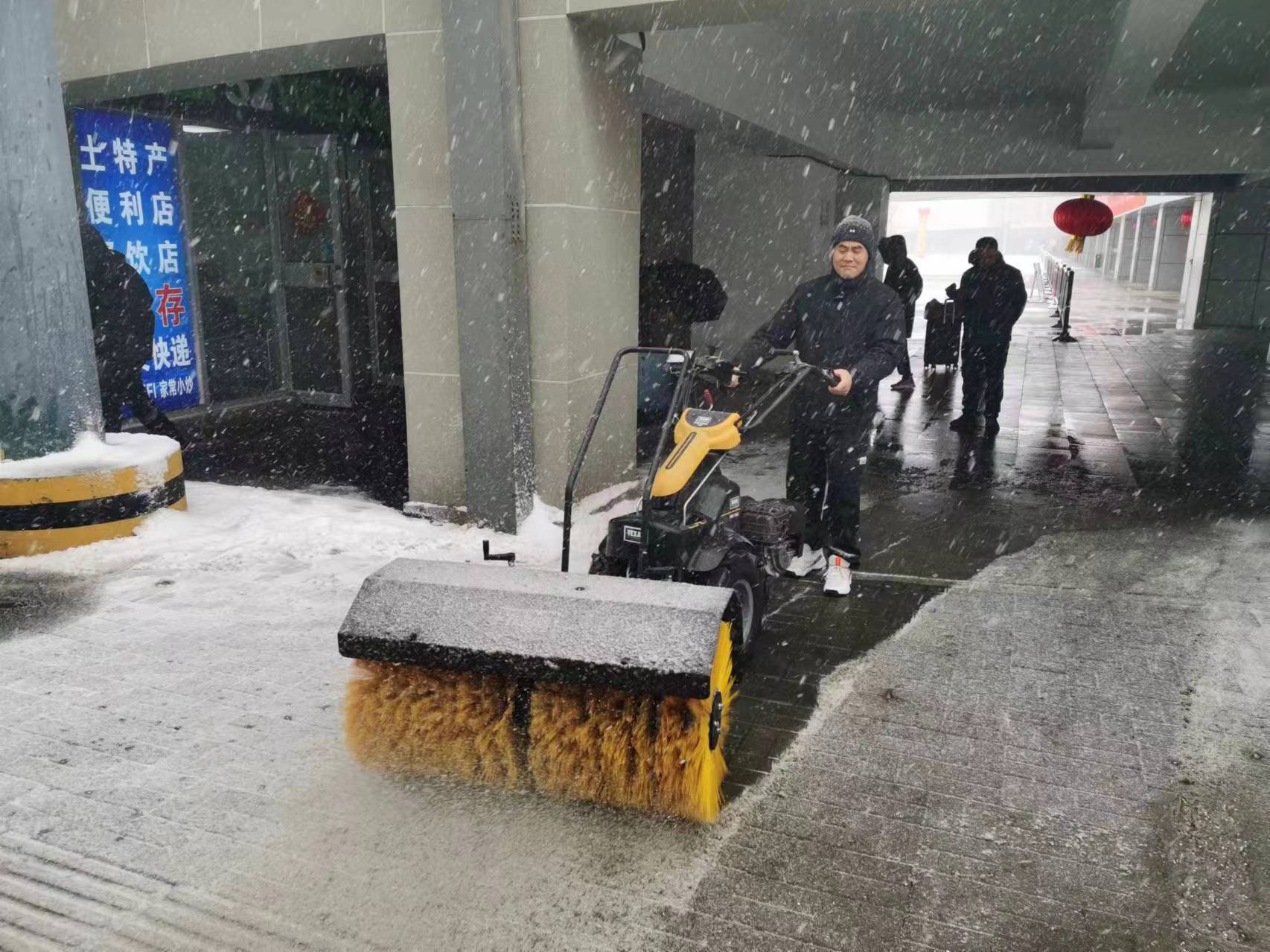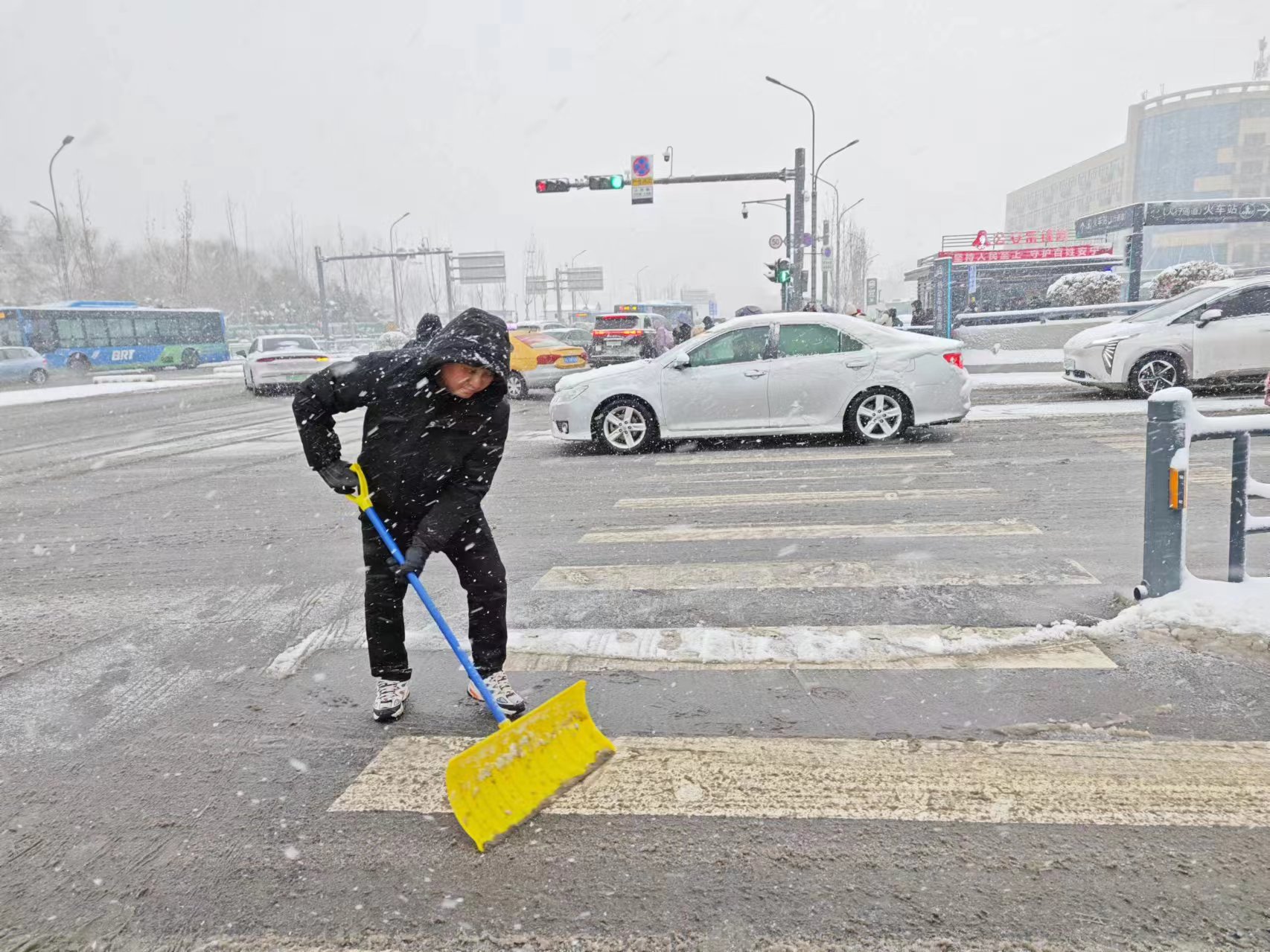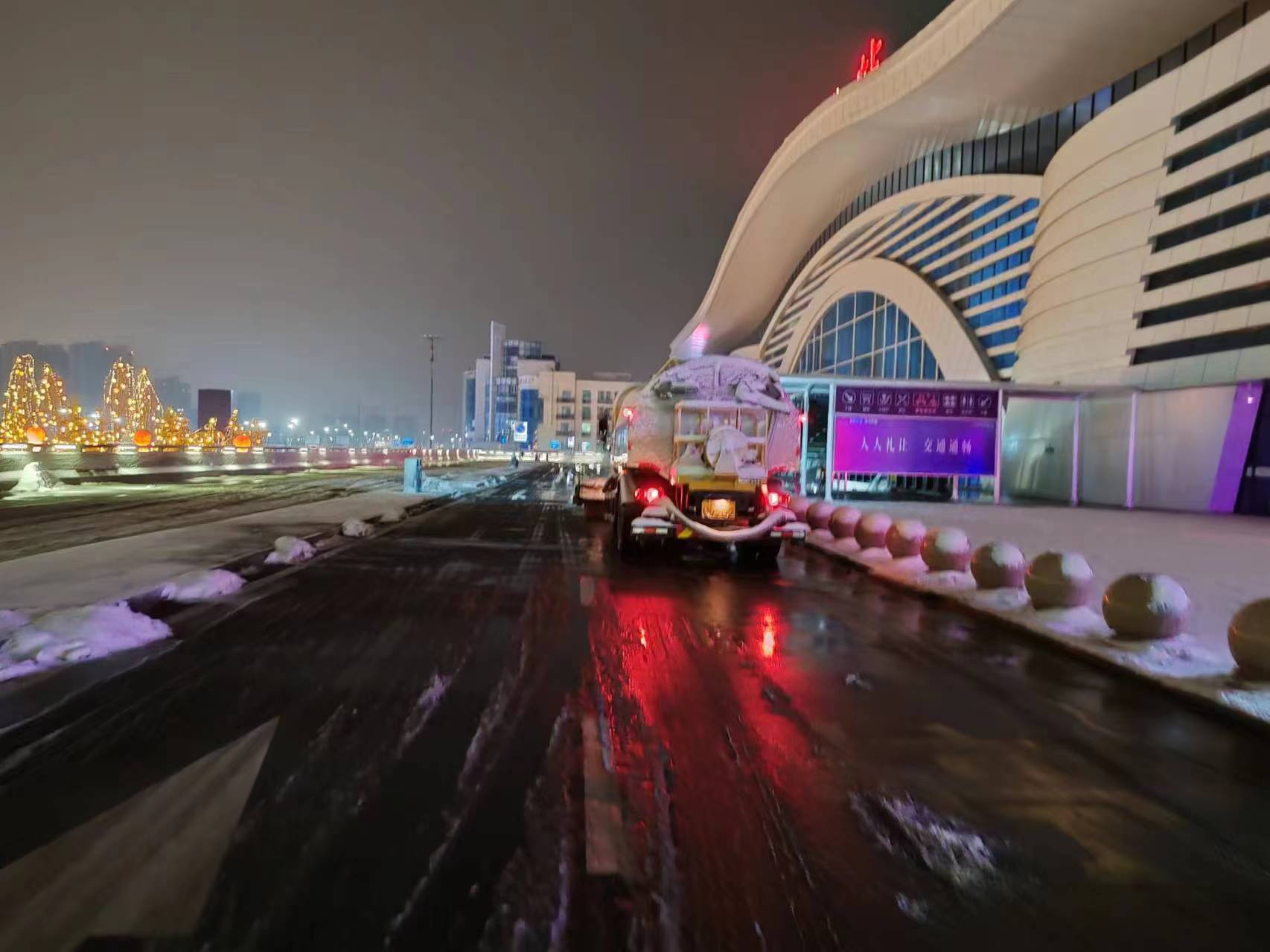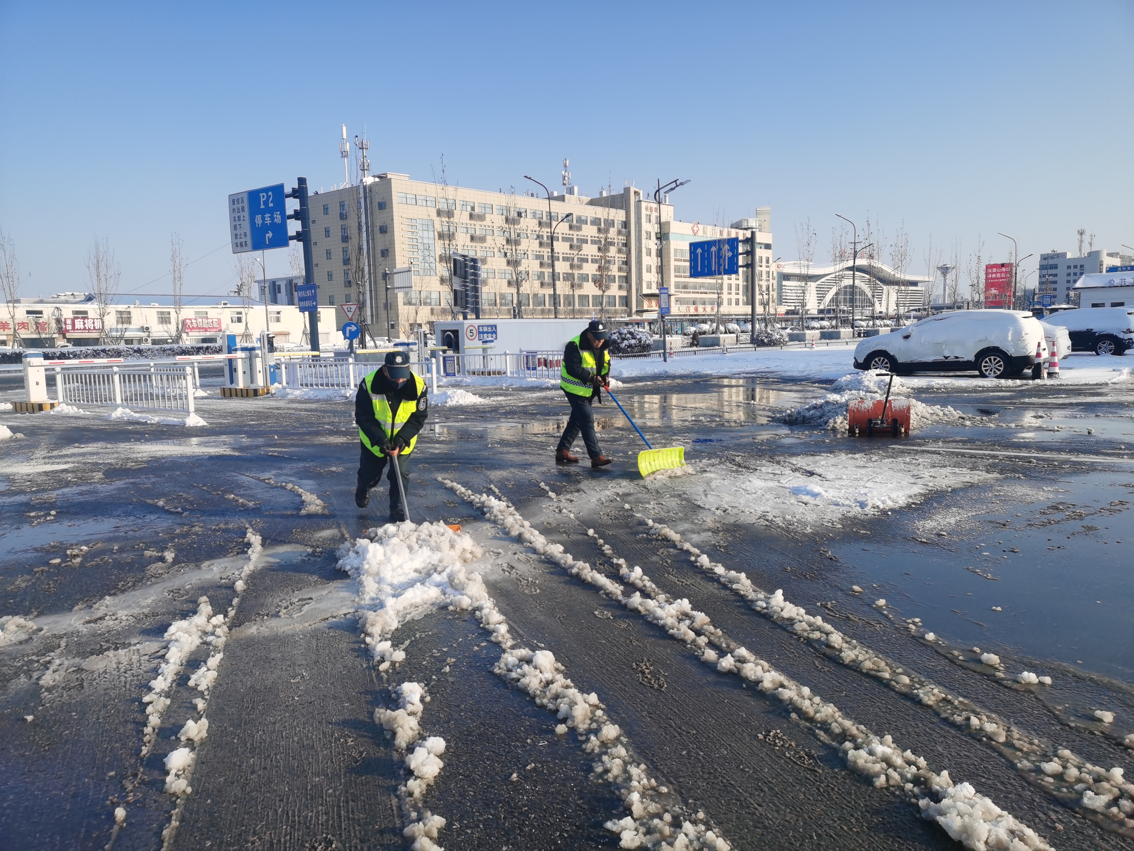 4日晚间温度降至极值,在白天12小时的高强度除雪融冰工作后,枢纽应急保障队伍再次以行动展现出国企的使命担当和社会责任,全力以赴通宵热血奋战,吴心航一行既当指挥员又当战斗员,做好整夜的指挥调度和督导检查之余,主动参与到一线除雪中。漫漫风雪夜,综合客运枢纽户外、室内人力、机器循环组合作业,几十名工作人员与融雪剂、除雪车、扫地机、推雪铲、推雪板、铁锹等工具齐上阵,打下了一场坚实硬战。
