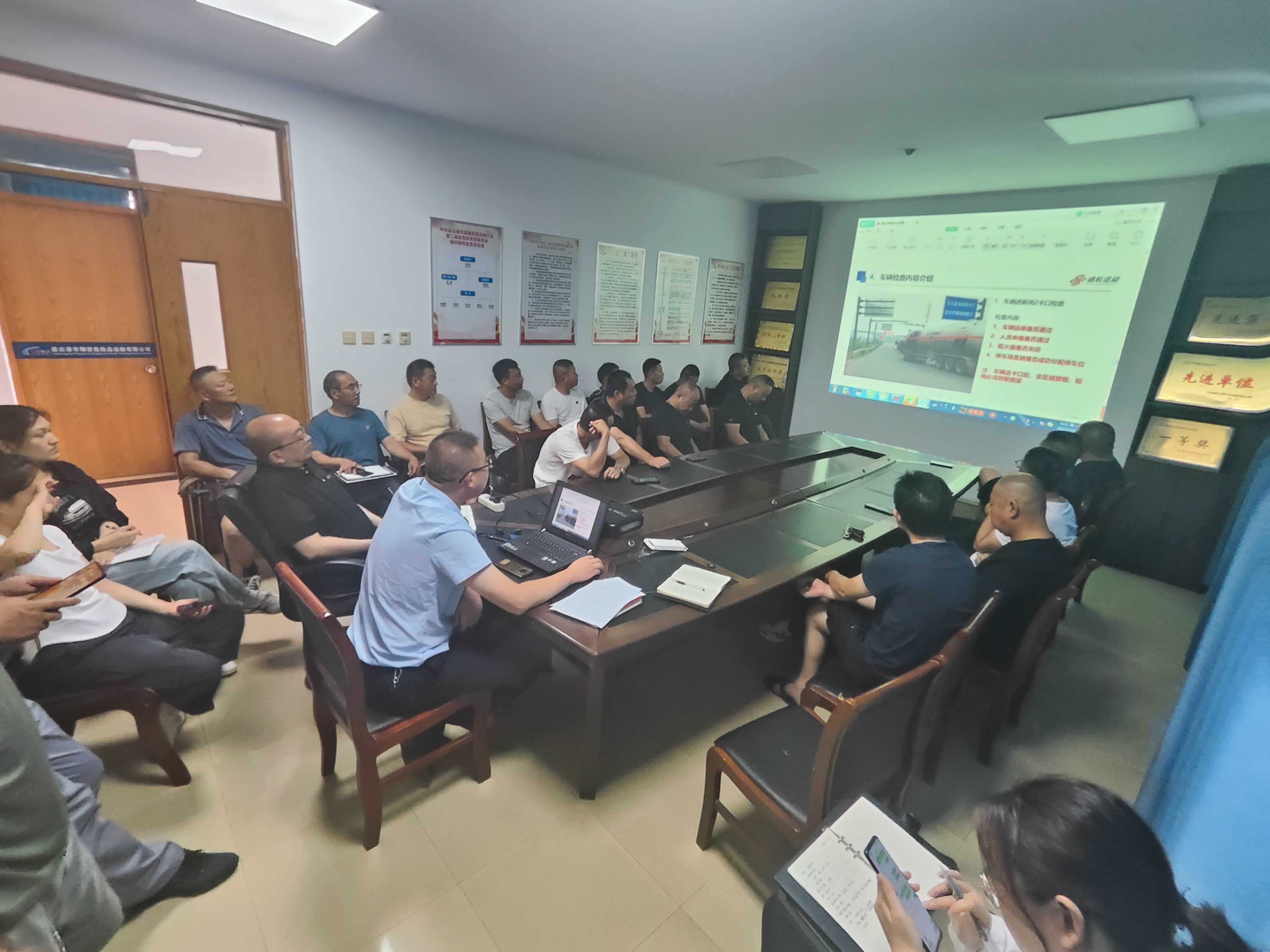 此次培训主要对盛虹港储介绍、石化园区入园申报介绍、停车场签到功能介绍、车辆检查内容介绍、装卸货要求等进行了培训,现场向从业人员明确入园申报要求、普及装卸货注意事项及危化品车辆安全检查、作业防护要求等相关安全知识,课间还以提问的方式进行了互动。期间,翔安公司经理许安庆要求所有从业人员,认真遵守厂家各项管理规定,按要求做好APP入园申报工作、危险品运输车辆安全检查工作、作业期间严格遵守操作规程,按要求正确穿戴使用劳动防护用品。