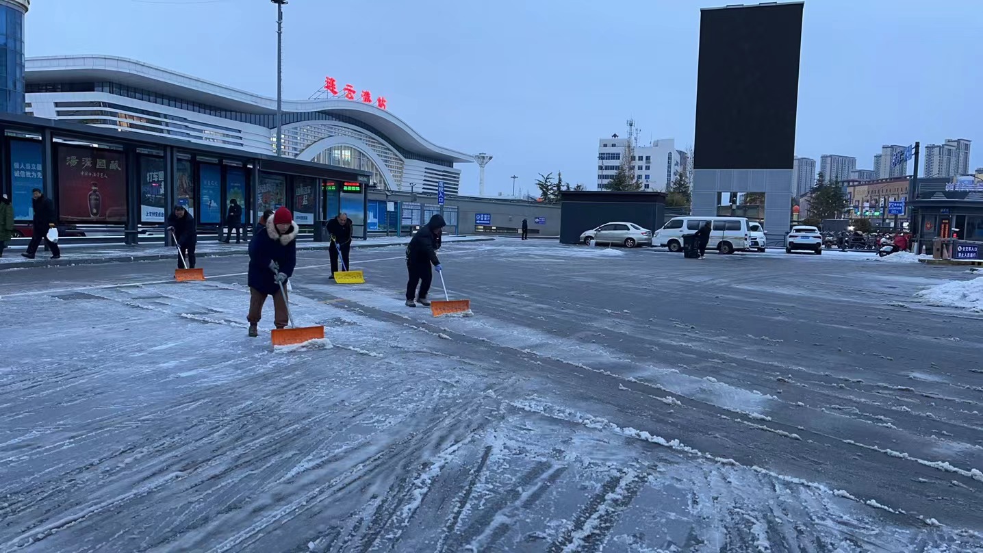 19日15时,交通集团建立了3支应急队伍,共储备融雪剂8吨,并及时补充;应急车辆、手推式抛洒机、手推车、除雪机、铁锹、扫把等大量工具齐上阵。随着天气变化,交通集团于19日21时启动冬季除雪防滑应急处置预案,一支由18人组成的融雪除冰应急小组迅速行动,冒冻雨开始逐步分段在出入口、人行通道、停车场出入口处等关键区域分段抛洒融雪剂,有效防止了道路结冰,确保了市民旅客的出行安全。20日,融雪除冰应急队伍增至35人,除雪设备、应急车辆数量翻倍,综合客运枢纽现场办全体干部职工24小时奋战一线,全域抛洒融雪剂5次,使用融雪剂总量达12吨。连夜的融雪除冰保障了连云港站早班高铁列车旅客的出行安全。