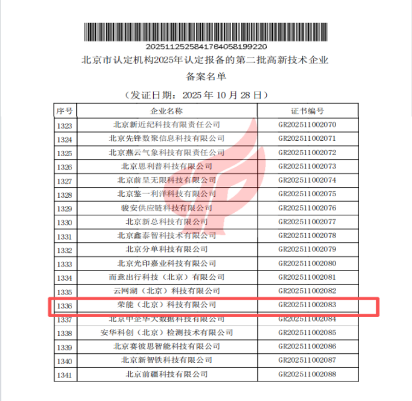 2025年11月25日,荣能(北京)科技有限公司(以下简称 “荣能公司”)传来喜讯:经国家相关部门严格审核,公司正式通过国家高新技术企业认定,成功获评“国家高新技术企业”称号(认证编号:GR202511002083)。