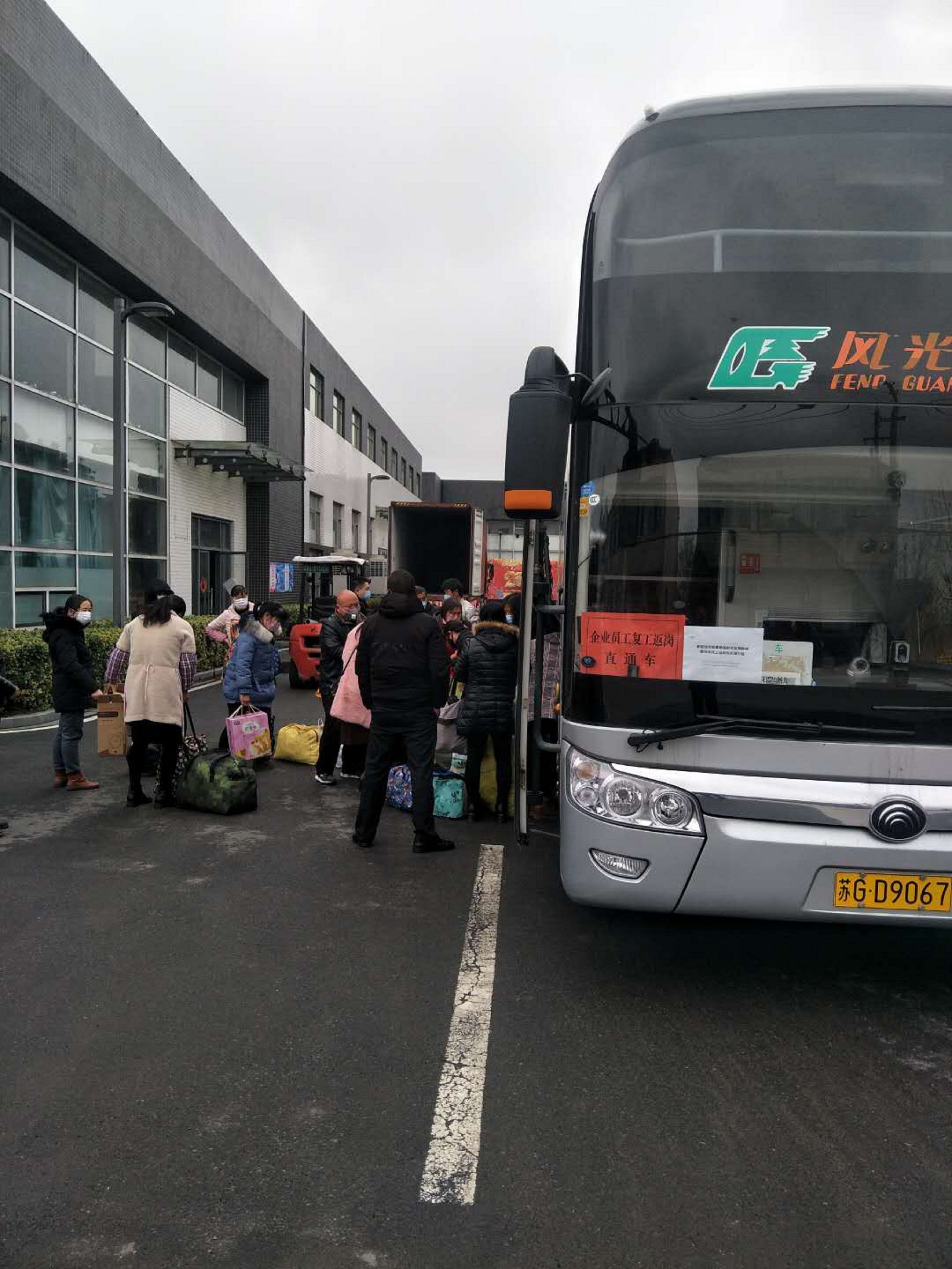 2月29日,连汽东海公司包车直通车再赴镇江丹阳运送远景假日公司第二批员工返岗复工。出发前,公司认真落实防疫安全措施,随车配备体温检测设备和消毒液等防护用品,车辆后排设置隔离区,车辆安排两位技术过硬的驾驶员轮流驾驶,驾驶员全程佩戴口罩,确保个人防护落实到位。工作人员还为客车进行了全面安全“体检”,确保车辆技术状况良好。当天一早,2名参运驾驶员早早来到车站测量体温,按照规定程序有条不紊做好发车准备工作。公司主要领导要求驾驶切实把运输安全放在首位,同时要认真落实防疫工作,确保返岗复工人员平安到达目的地。