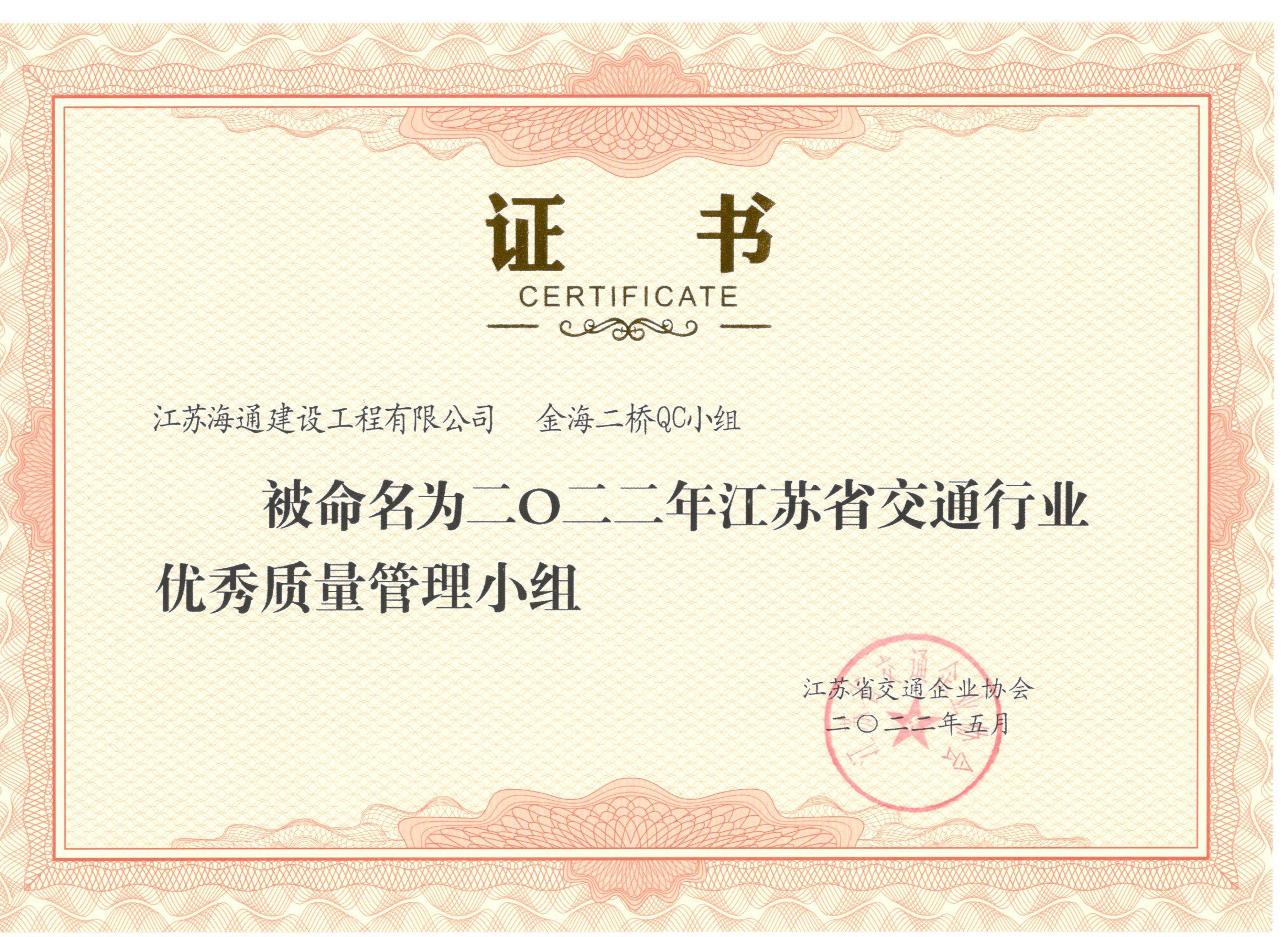 近日,江苏省交通企业协会在南京召开了2022年度江苏省交通运输行业优秀QC成果发布会,会上颁发了2022年江苏省交通行业优秀质量管理小组奖状,同时对择优选出的QC成果现场发布进行了评奖。江苏海建公司顶天立地QC小组和金海二桥QC小组被评为2022年江苏省交通行业优秀质量管理小组。顶天立地QC小组及成果《提高路缘石拆除利用率》获得2022年优秀QC小组活动成果二等奖。
