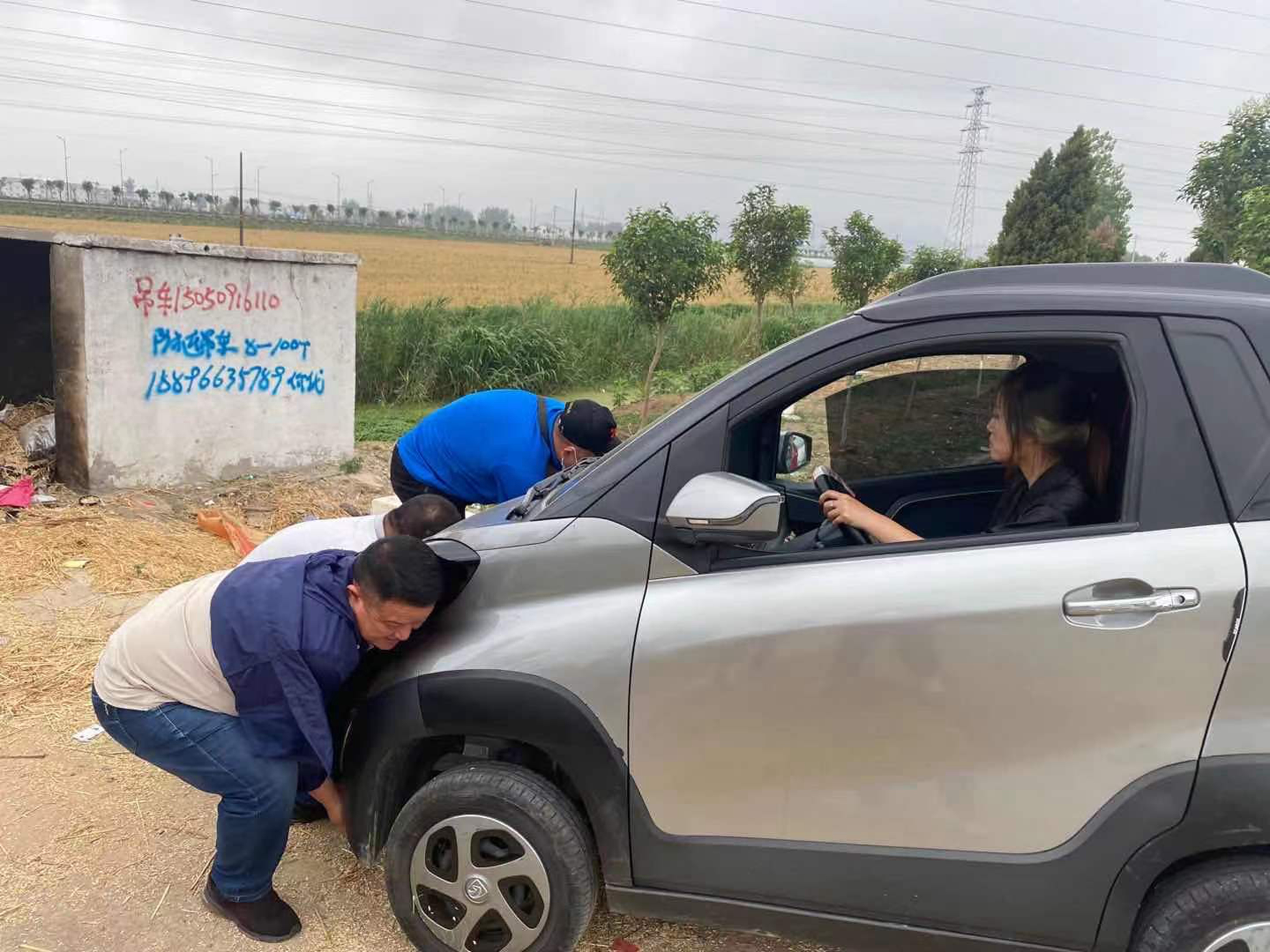“先让孩子下车,转移到安全位置!打好方向!”任洪志和唐蔚斌边安慰边指挥,让刘女士集中注意踩住刹车,以防溜车;王洪军从车上拿来三角架放在现场以作警示。随后,三位驾驶员合力,成功将小车抬到安全区域。