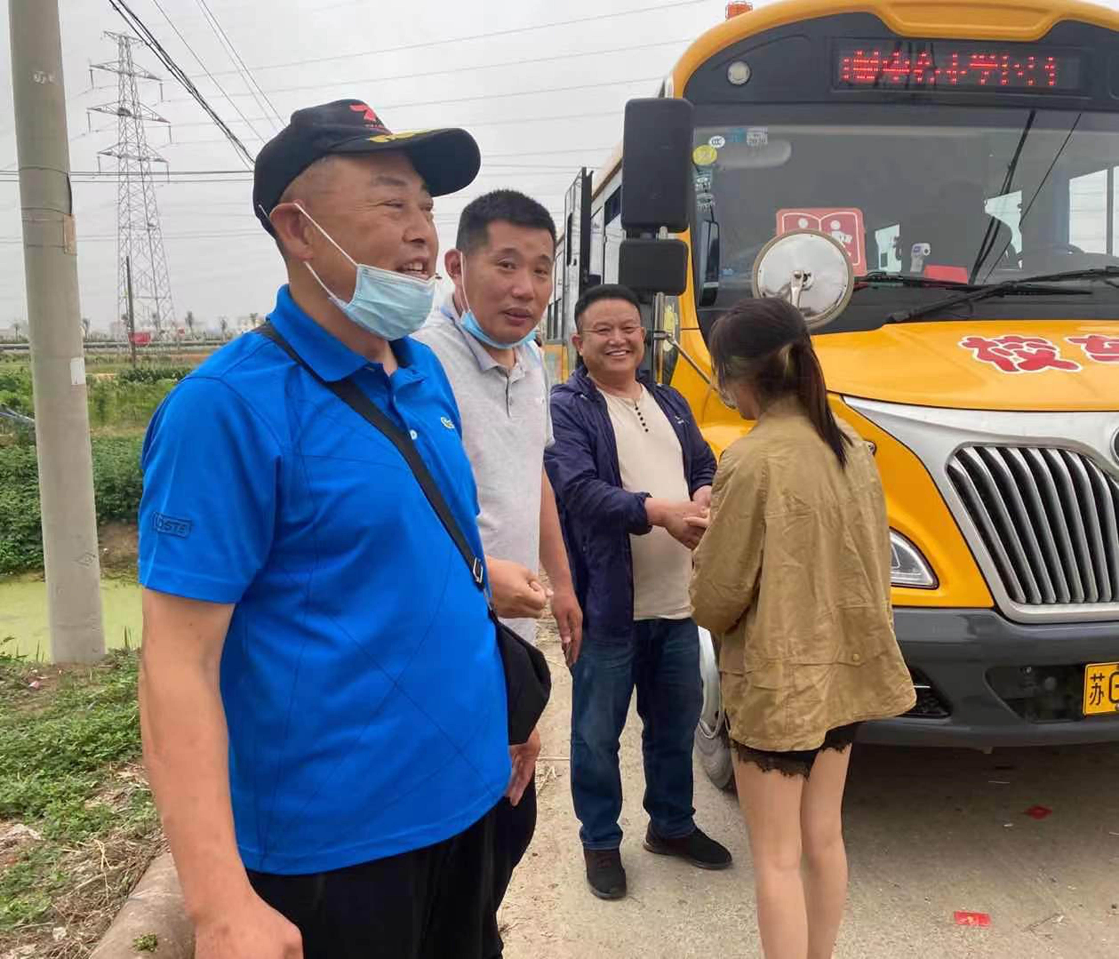三位校车驾驶员摆了摆手说:“这是我们应该做的,快送你的孩子上学吧。”