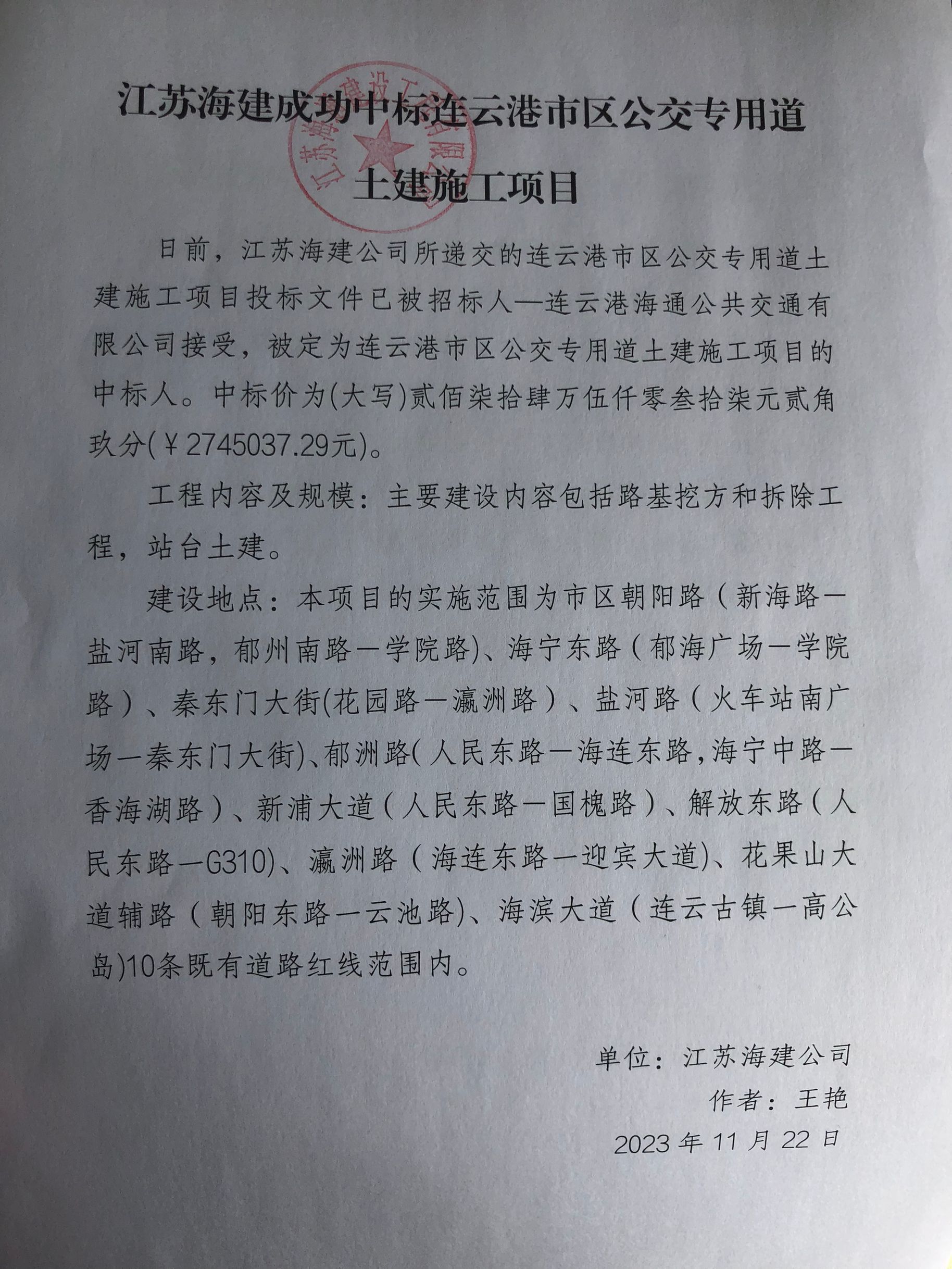 日前,江苏海建公司所递交的连云港市区公交专用道土建施工项目投标文件已被招标人—连云港海通公共交通有限公司接受,被定为连云港市区公交专用道土建施工项目的中标人。中标价为(大写)贰佰柒拾肆万伍仟零叁拾柒元贰角玖分(¥2745037.29元)。