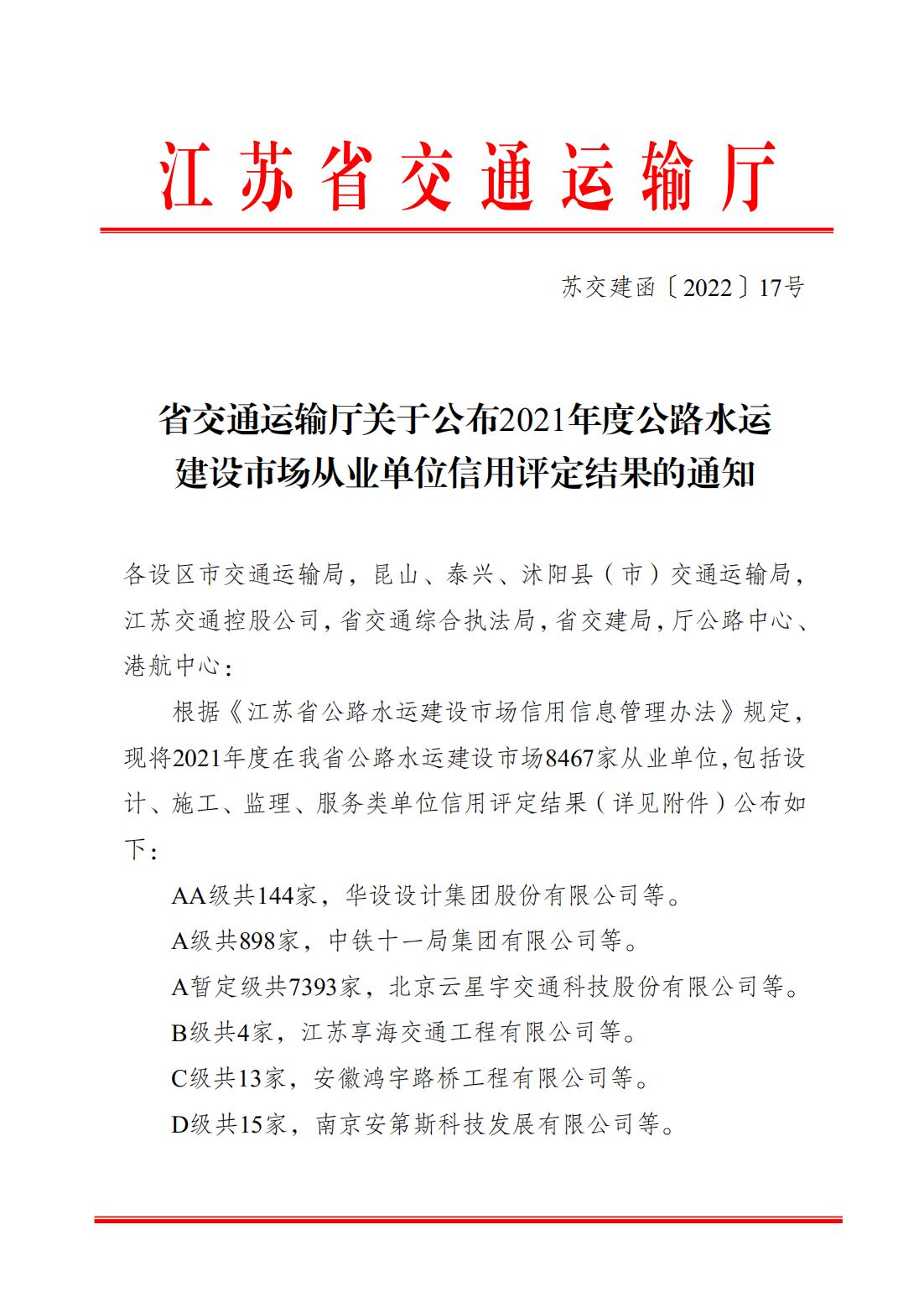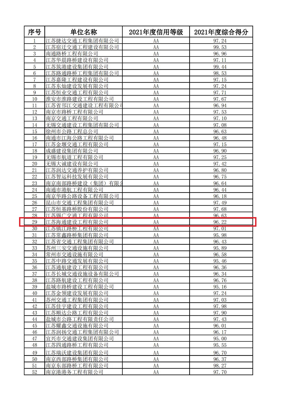 近日,从江苏省交通运输厅相继公布的《2021年度公路水运建设市场从业单位信用评定结果》和《2021年度公路水运建设市场守信激励和严重失信主体对象名单》文件中获悉,江苏海通建设工程有限公司2020年度、2021年度连续两年被评定为江苏省公路水运建设市场“AA”信用单位,并进入江苏省公路水运建设市场守信激励单位名单(“红名单”),这是本企业成立以来获得的最高信用评价,也是连云港市唯一获此两项殊荣的公路水运施工企业。