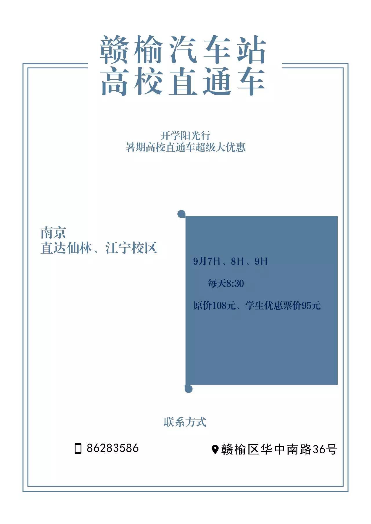 学生返程高峰到来前期,赣榆公司领导班子积极研究,超前谋划,针对年轻群里越来越依赖网络购票的特点,充分利用赣榆汽车站微信公众号积极发布优惠活动讯息。发动站内年轻群体利用朋友圈积极转发活动讯息。校园直通车活动时间为8月31日至9月16日,满足了大学生们不同的返程时间,范围为苏州、南京江宁等高校,返校师生可通过“连云港汽运”网站、微信公众号(lqgyqcz)、“巴士管家”APP或站内售票窗口、自助售票机等查询购买校园直通车车票。