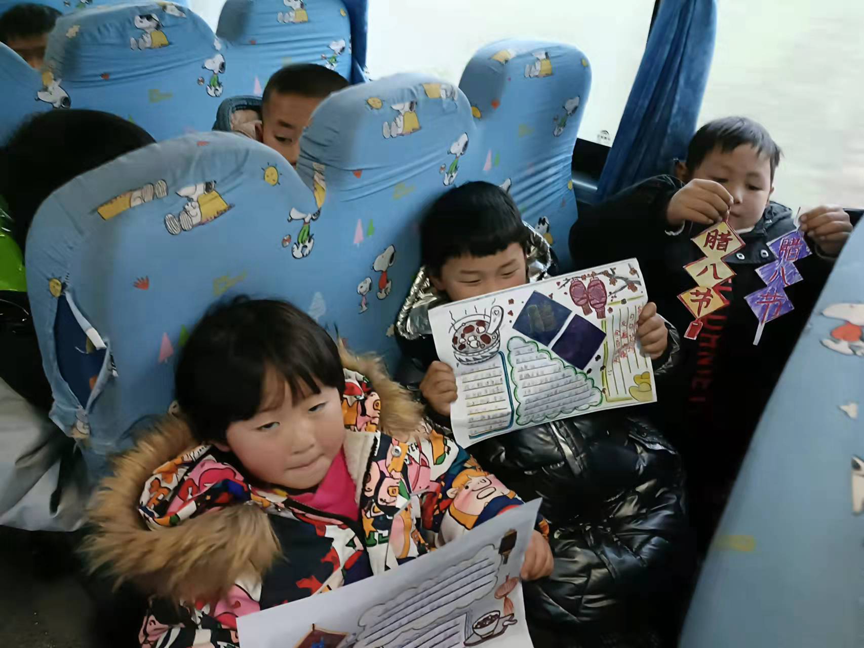 随车照管员向乘车学生讲解了腊八节的由来以及腊八的习俗,腊八节这一天,家家都要吃上一碗热乎乎的腊八粥并且还会赠与他人,寓意美好的祝福传递下去。随后照管员与学生一起唱起了关于腊八粥的童谣,学生们还展示了用自己灵巧双手创作的一幅幅有关于腊八节的手抄报和灯笼,为腊八节增添了节日气氛。