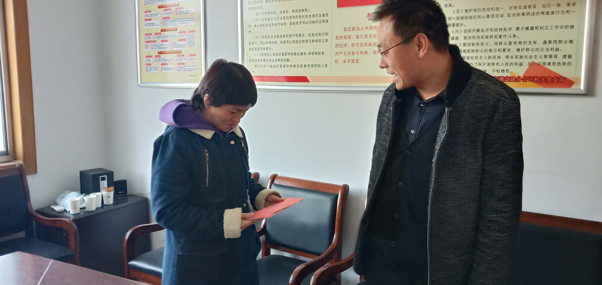 3月27日上午,江苏海建交建分公司党总支书记、经理徐其翔将公司党员职工捐助的爱心款交到职工徐海燕手中,希望徐海燕家庭早日度过困难。