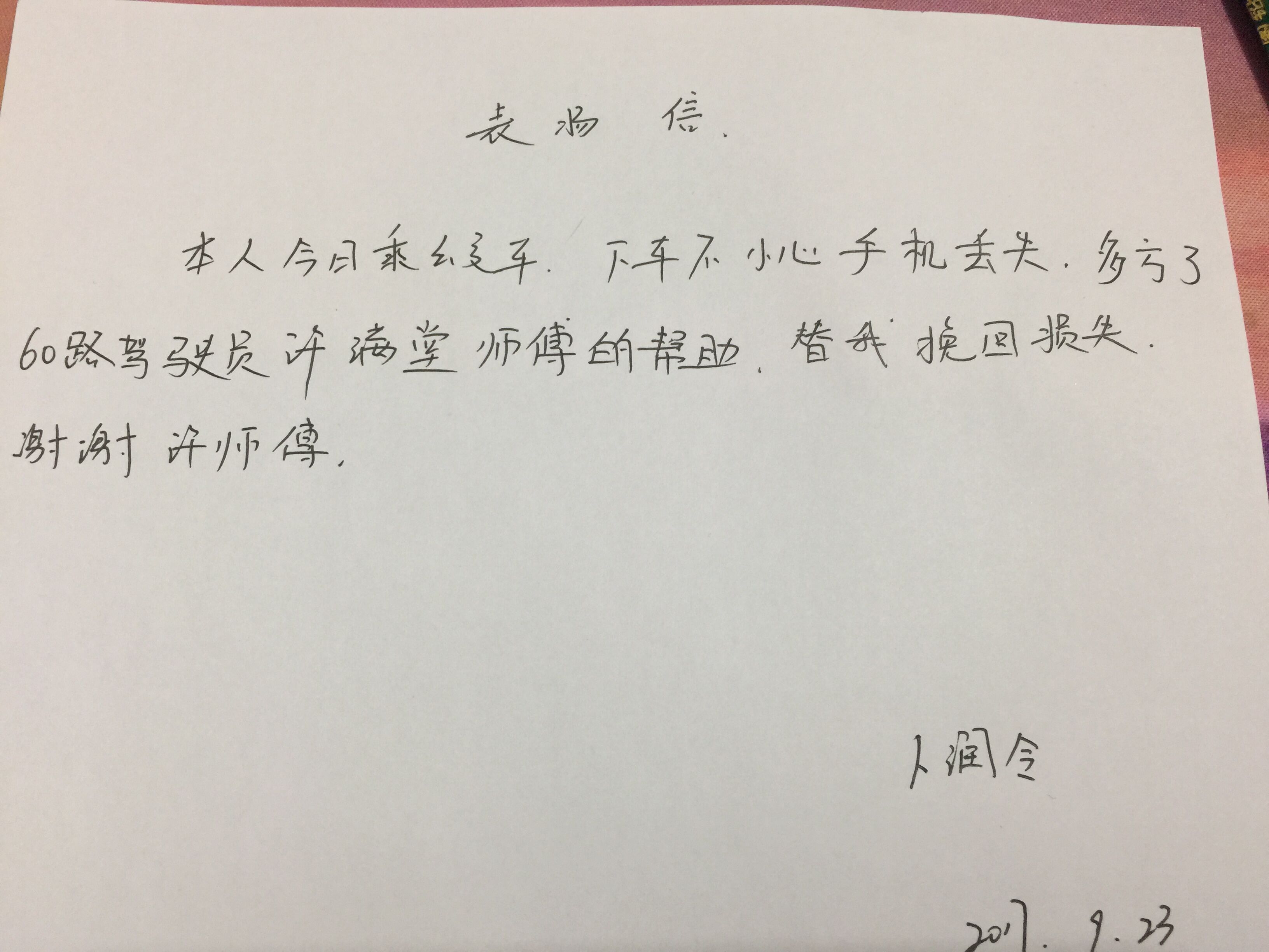 当日中午,卜先生按约定的时间来到香溢公交总站,顺利取回了手机,卜先生拿出200元给许师傅为表谢意,被婉言谢绝。次日,乘客送来一封感谢信至公交新浦公司车队,对驾驶员许满堂的热情帮助表示感谢。