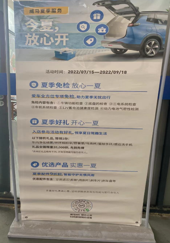 活动期间,公司将通过线上、线下宣传以及电话邀约的形式,邀请威马新能源汽车客户进店对车辆功能、三电系统、车机系统、12V蓄电池健康度以及动力电池气密性等方面开展免费的全方位专项检查和保养,并为入店参与活动的客户送出精美礼品。