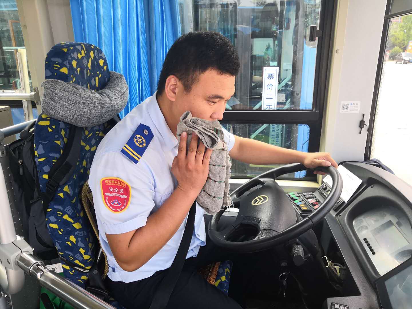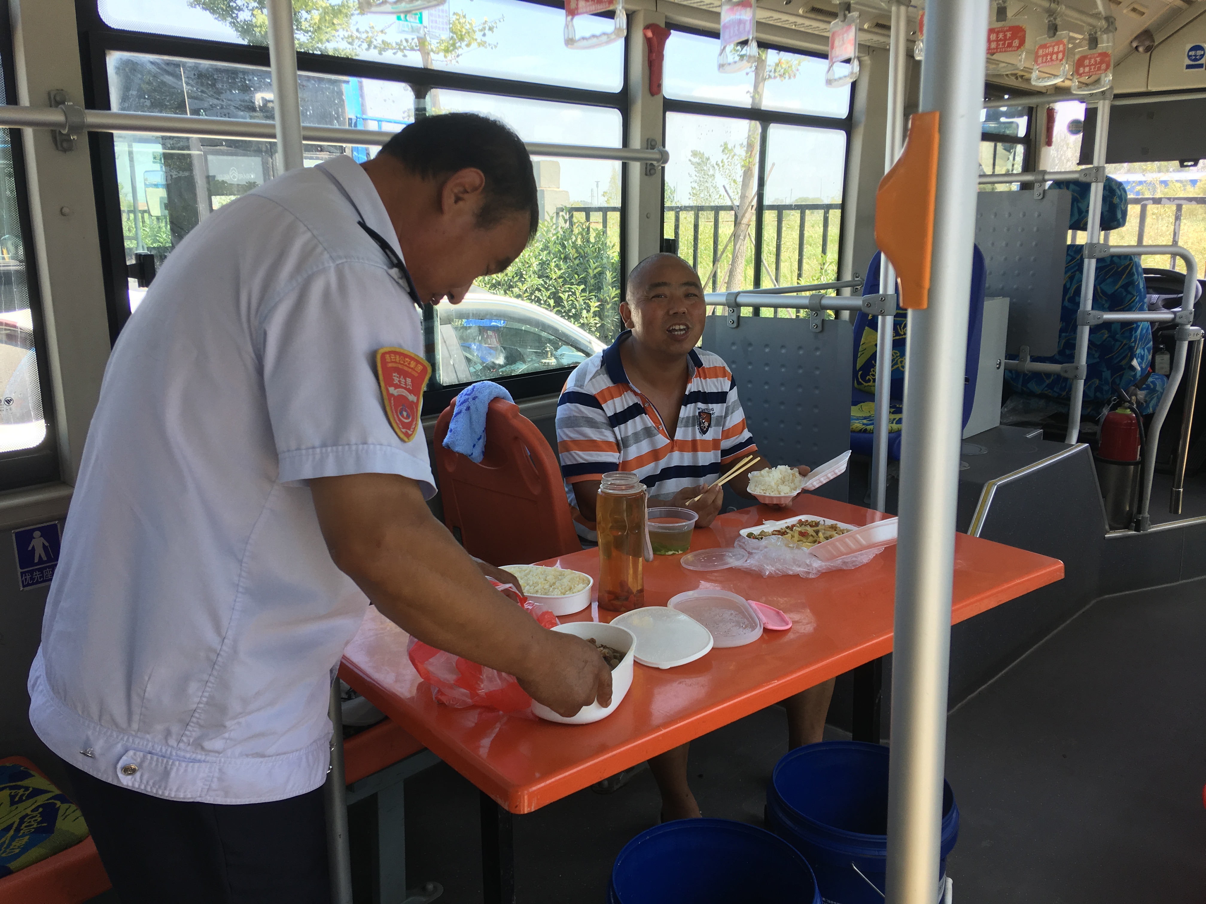 即使是在高温天气,为了保证市民乘客的日常出行,港城的公交人们忍受着高温酷暑依旧坚守岗位,默默地挥洒着汗水。公交集团海通公交公司为切实践行“分公司为一线驾驶员服务”的服务理念,各分公司实行轮流值班制,在线路车辆密集的西城公交停车场,上午10:30左右,公司安排一辆电动车停放场内,车上摆放了简易餐桌和饮用水供驾驶员休息、吃饭使用。